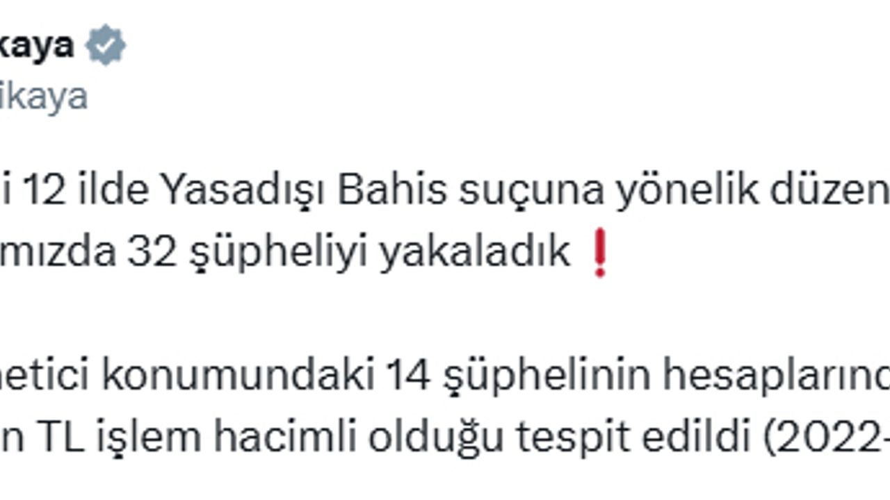 ANKARA, (DHA)- İÇİŞLERİ Bakanı Ali Yerlikaya, Tokat merkezli 12 ilde 'Yasa dışı bahis' suçuna yönelik düzenlenen operasyonda 32 şüphelinin yakalandığını açıkladı.