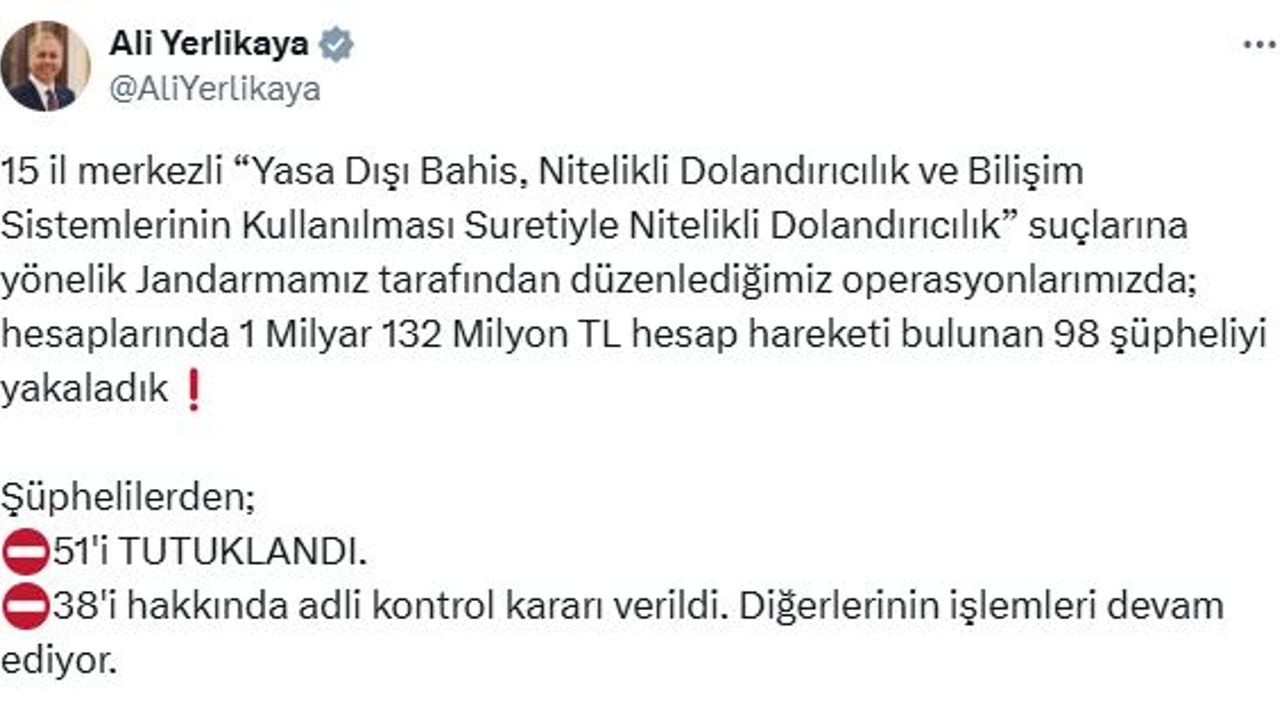 İçişleri Bakanı Ali Yerlikaya, siber suçlara yönelik jandarma tarafından düzenlenen operasyonun sonuçlarını sosyal medya hesabından paylaştı. Buna göre; 15 ilde 'Yasa dışı bahis', 'Nitelikli dolandırıcılık' ve 'Bilişim sistemlerinin kullanılması suretiyle nitelikli dolandırıcılık' suçlarına yönelik düzenlenen operasyonda hesaplarında 1 milyar 132 milyon TL hareket bulunan 98 şüpheli yakalandı. Çok sayıda cep telefonu, sim kart, bilgisayar, banka kartı, kripto cüzdan ve dijital materyal ele geçirildi. Şüphelilerden 51'i tutuklandı, 38'i hakkında adli kontrol kararı verildi, diğerlerinin işlemleri devam ediyor.