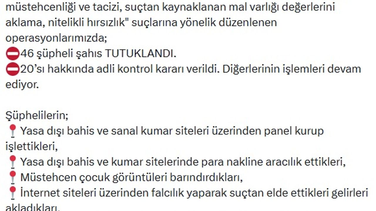 "Siber suçlarla mücadele kapsamında son 5 günde 179 şüpheliyi yakaladık. 17 il merkezli 'Yasa dışı bahis, nitelikli dolandırıcılık, çevrim içi çocuk müstehcenliği ve tacizi, suçtan kaynaklanan mal varlığı değerlerini aklama, nitelikli hırsızlık' suçlarına yönelik düzenlenen operasyonlarımızda, 46 şüpheli şahıs tutuklandı. 20'si hakkında adli kontrol kararı verildi. Diğerlerinin işlemleri devam ediyor. Konya, Erzurum, Tekirdağ, Niğde, Şanlıurfa, İzmir, Mersin, Tokat, Eskişehir, Gaziantep, Kocaeli, Artvin, Sinop, İstanbul, Aksaray, Antalya, Bursa merkezli Mardin, Adana, Karaman, Sivas, Osmaniye, Diyarbakır, Balıkesir, Ordu, Kilis, Manisa, Hatay, Ankara, Aydın, Bingöl, Kahramanmaraş, Çorum, Edirne, Hakkari, Kırklareli ve Malatya'da gerçekleştirilen operasyonlarda yakalanan şüphelilerin, 7545 sayılı Siber Güvenlik Kanunu'na muhalefet, bilişim sistemlerinin araç olarak kullanılması suretiyle nitelikli dolandırıcılık, yasa dışı bahis, çevrim içi çocuk müstehcenliği, bilişim sistemine girme, nitelikli hırsızlık, suç işlemek amacıyla örgüt kurma ve örgüte üye olma, suçtan kaynaklanan mal varlığı değerlerinin aklanması suçlarından savcılıklarımızca haklarında soruşturma başlatıldı. Yaklaşık 107 milyon lira değerinde 2 araç, 2 deniz aracı ile 2 şirkete el konuldu."