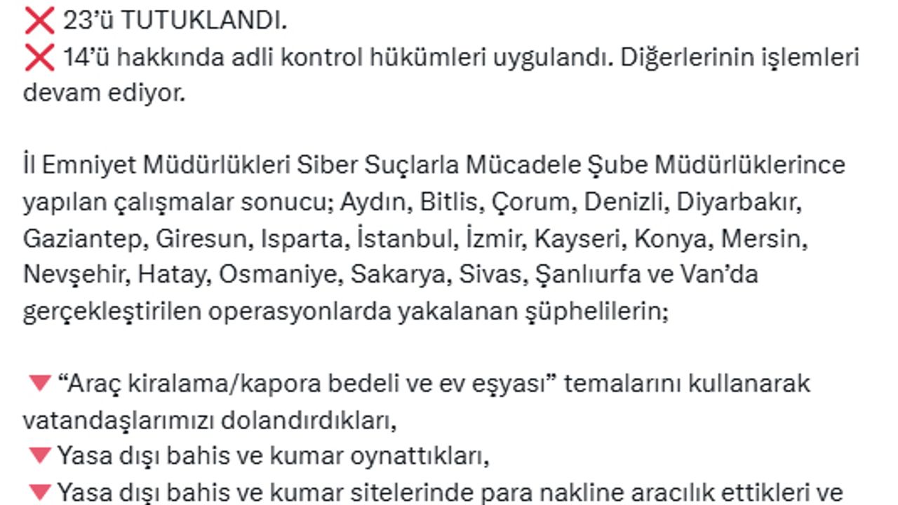 İçişleri Bakanı Ali Yerlikaya, Emniyet Genel Müdürlüğü koordinesinde düzenlenen operasyonu, sosyal medya hesabından paylaştı. Buna göre; 20 ilde 'Çevrim içi çocuk müstehcenliği', 'Bilişim sistemlerinin kullanılması suretiyle nitelikli dolandırıcılık', 'Banka veya kredi kartlarının kötüye kullanılması', 'Yasa dışı bahis' suçlarına yönelik düzenlenen operasyonda 55 şüpheli yakalandı. Operasyon sonucu çok sayıda dijital materyal ele geçirildi. Yakalanan şüphelilerden, 23'ü tutuklandı, 14'ü hakkında adli kontrol hükümleri uygulandı. Diğerlerinin işlemleri devam ediyor. (DHA)