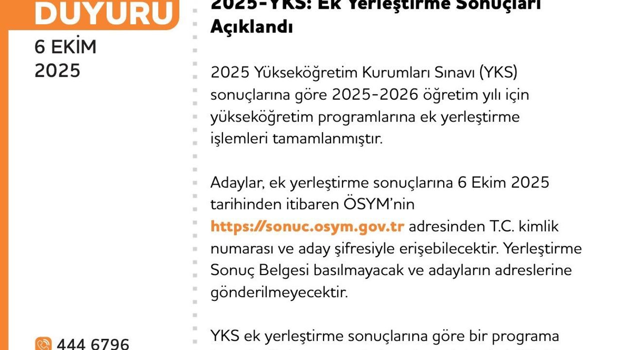 ANKARA, (DHA)- ÖLÇME, Seçme ve Yerleştirme Merkezi (ÖSYM) Başkanlığı, 2025 Yükseköğretim Kurumları Sınavı (YKS) sonuçlarına göre, 2025-2026 öğretim yılı için yükseköğretim programlarına ek yerleştirme işlemlerinin tamamlandığını duyurdu.