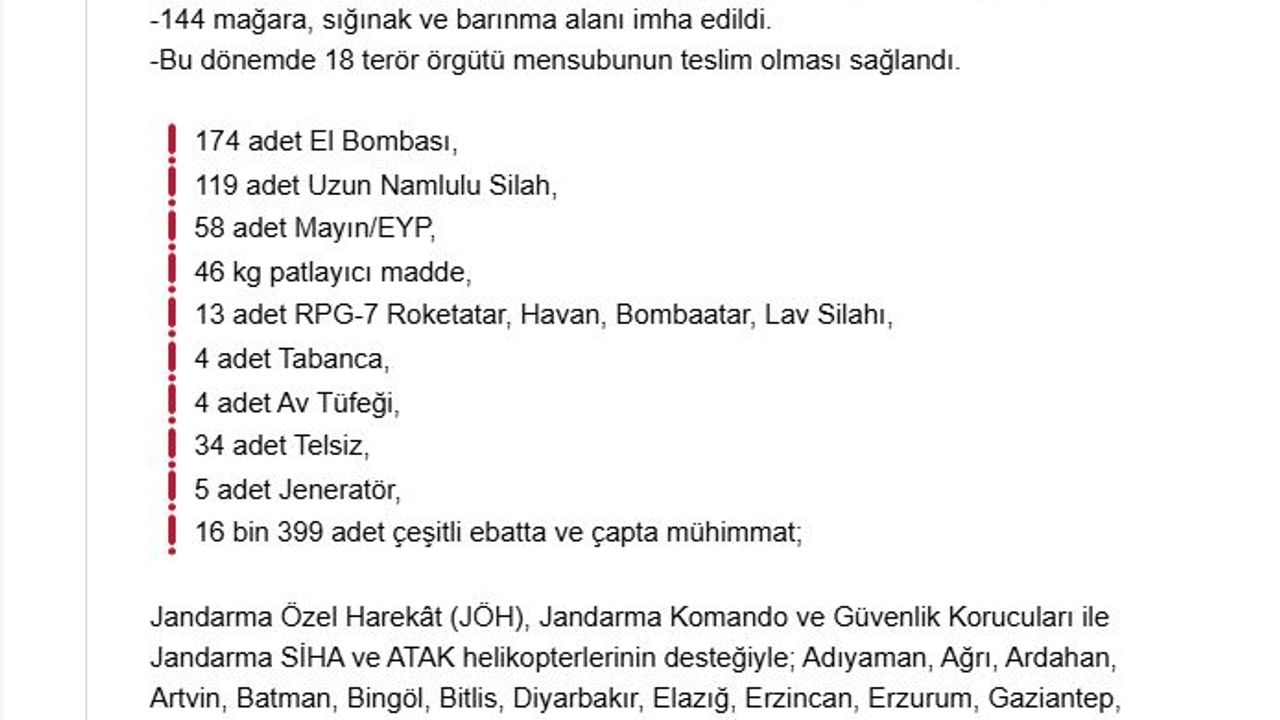 İçişleri Bakanı Ali Yerlikaya, jandarma tarafından devam eden terörle mücadele çalışmalarına ilişkin NSosyal hesabından açıklama yaptı. Buna göre; 30 ilde son 6 aydır devam eden arazi taramalarında 144 mağara, sığınak ve barınma alanı imha edildi. Bu dönemde 18 terör örgütü mensubunun teslim olması sağlandı. Jandarma Özel Harekat (JÖH), Jandarma Komando ve güvenlik korucuları ile SİHA ve ATAK helikopterlerinin desteğiyle düzenlenen saha taramalarında 174 el bombası, 119 uzun namlulu silah, 58 mayın/EYP, 46 kilogram patlayıcı madde, 13 RPG-7 roketatar, havan, bombaatar, lav silahı, 4 tabanca, 4 av tüfeği, 34 telsiz, 5 jeneratör, 16 bin 399 çeşitli ebatta ve çapta mühimmat ele geçirildi. (DHA)