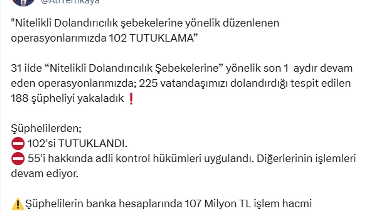 İçişleri Bakanı Ali Yerlikaya, 'Nitelikli dolandırıcılık' şebekelerine yönelik Emniyet Genel Müdürlüğü koordinesinde son bir aydır devam eden operasyonları sosyal medya hesabından paylaştı. Buna göre; 225 vatandaşı dolandırdığı tespit edilen 188 şüpheli yakalandı. Şüphelilerden 102'si tutuklandı, 55'i hakkında adli kontrol kararı verildi, diğerlerinin işlemleri devam ediyor. Şüphelilerin banka hesaplarında 107 milyon TL işlem hacmi bulunduğu tespit edildi.