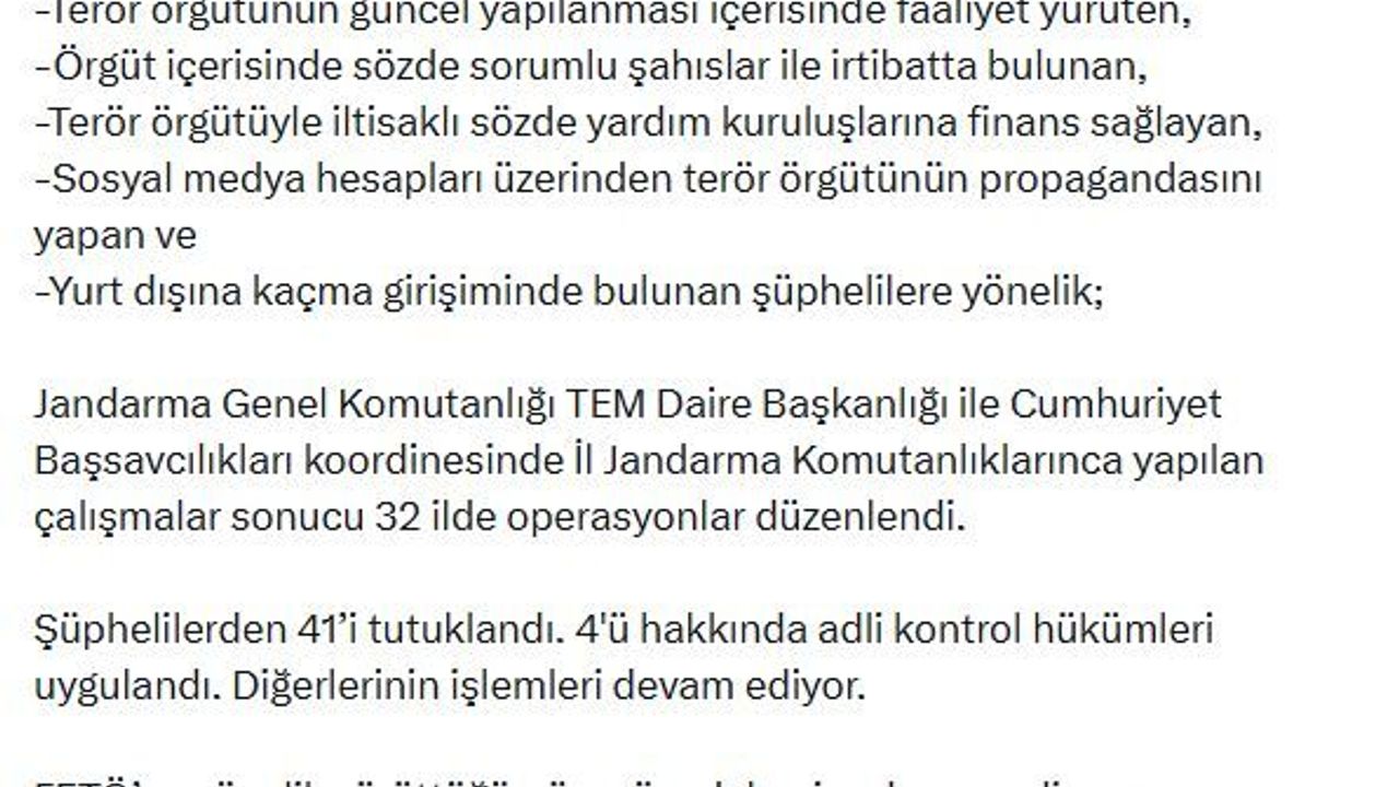 Bakanlığın sanal medya hesabından yapılan açıklamaya göre; FETÖ'nün güncel yapılanması içerisinde faaliyet yürüten şüphelilere yönelik 32 ilde operasyonlar düzenlendi. Operasyonlarda, örgüt içerisinde sözde sorumlu kişiler ile irtibatta bulunan, terör örgütüyle iltisaklı sözde yardım kuruluşlarına finans sağlayan, sanal medya hesapları üzerinden terör örgütünün propagandasını yapan ve yurt dışına kaçma girişiminde bulunan 64 şüpheli yakalandı. Şüphelilerden 41'i çıkarıldıkları hakimliklerce tutuklandı. 4'ü hakkında adli kontrol hükümleri uygulandı. Diğerlerinin işlemleri devam ediyor. (DHA)