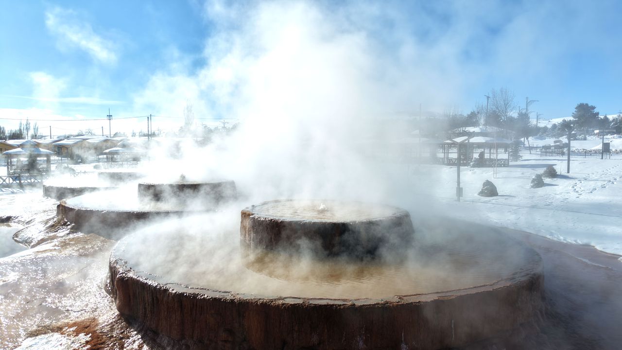 Eraydın AYTEKİN-Hüsnü Ümit AVCI/SİVAS, (DHA)- SİVAS'ta Pamukkale'ye kardeş olarak yapılan ve sarı renkli travertenleriyle dikkat çeken 'Altınkale'de, sıcak ve soğuk bir arada yaşanıyor. 45 derece sıcaklıktaki termal su, kentteki soğuk havanın etkisiyle borularla travertenlere ulaştırıldığı nokta anında buza dönüşüyor.