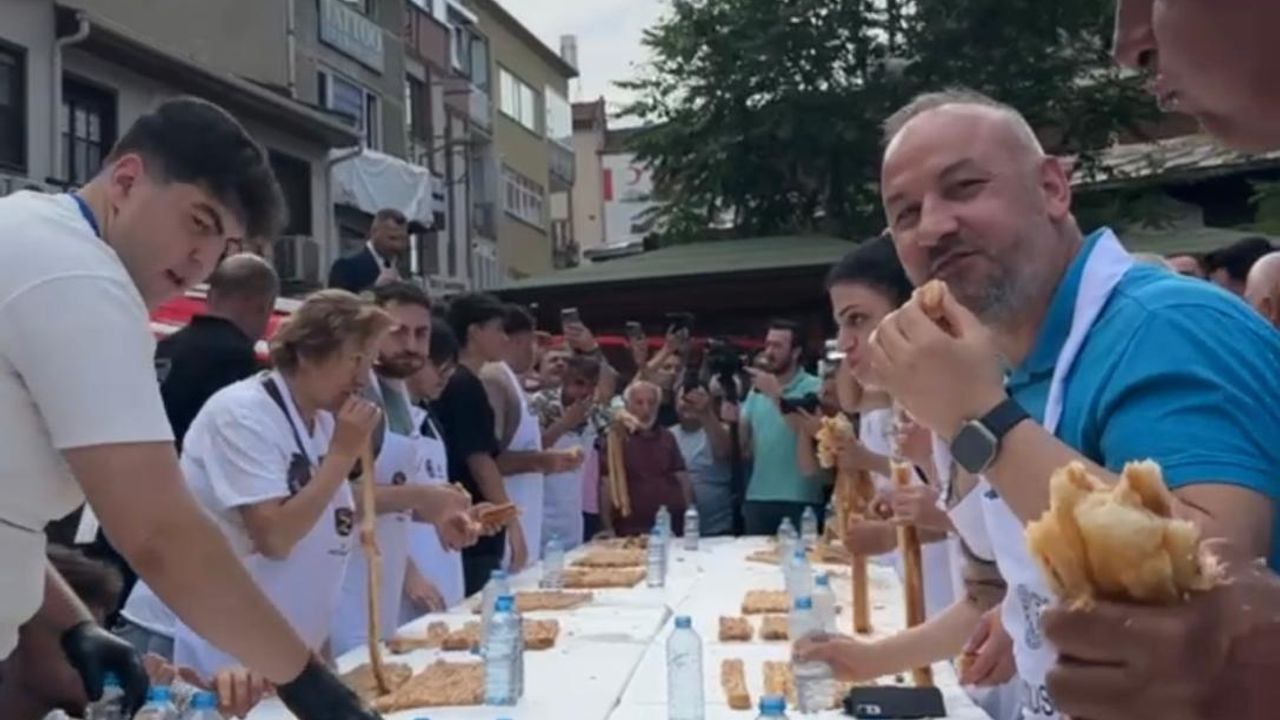 Yiğithan HÜYÜK/BURSA, (DHA)- BURSA’da, '14'üncü Börek Festivali'nde 5 dakika içinde 11 metre uzunluğunda börek yiyen Ali Kılıç, 1'inci olarak 10 gram altının sahibi oldu.