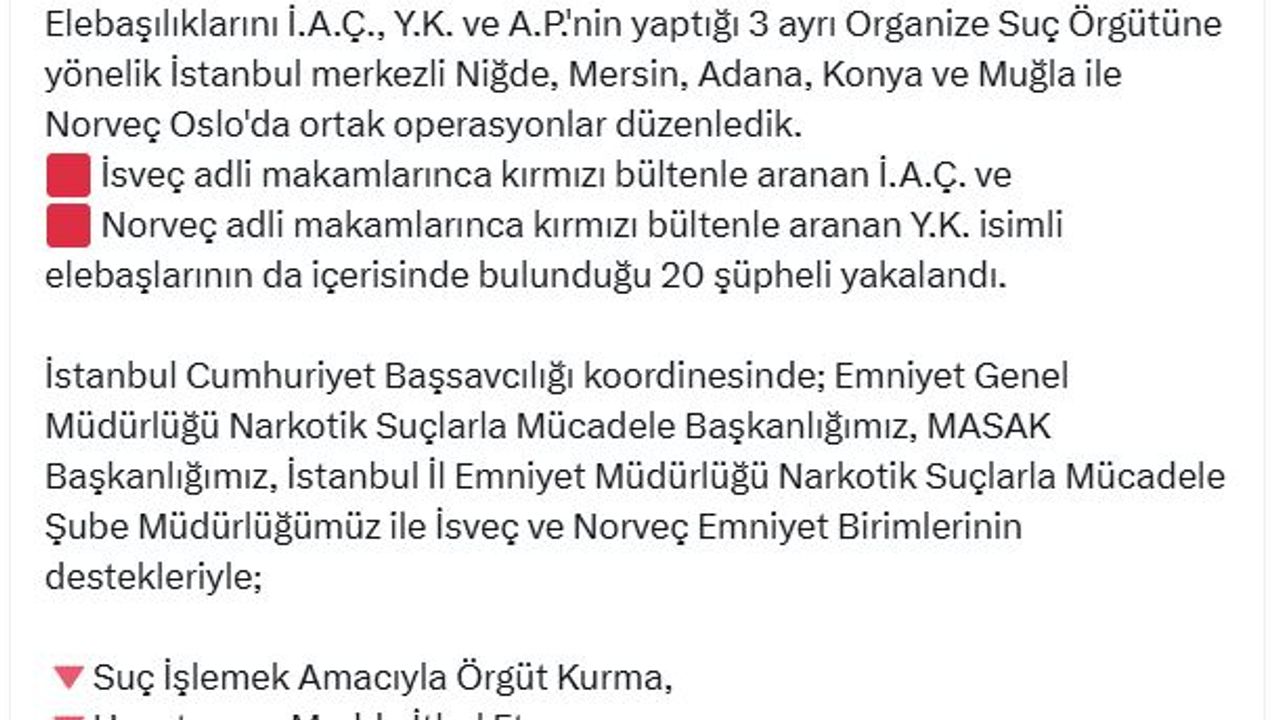 İçişleri Bakanı Ali Yerlikaya, organize suç örgütlerine yönelik Emniyet Genel Müdürlüğü koordinesinde düzenlenen operasyonu sosyal medya hesabından paylaştı. Buna göre; İsveç ve Norveç emniyet birimlerinin destekleriyle; elebaşılıklarını İ.A.Ç., Y.K. ve A.P.'nin yaptığı 3 ayrı organize suç örgütüne yönelik İstanbul merkezli Niğde, Mersin, Adana, Konya ve Muğla ile Norveç Oslo'da ortak operasyonlar düzenlendi. İsveç adli makamlarınca kırmızı bültenle aranan İ.A.Ç. ve Norveç adli makamlarınca kırmızı bültenle aranan Y.K. isimli elebaşlarının da içerisinde bulunduğu 20 şüpheli yakalandı. 3 suç örgütüne ait 1 ton 540 kilogram uyuşturucu madde yurt dışında ortak çalışma ile ele geçirildi. MASAK raporlarına istinaden şüphelilere ait; 53 taşınmaz, 27 araç, 15 şirket ve şirket ortaklığı tespit edilerek yaklaşık 1,5 milyar TL değerindeki mal varlığına el konuldu.