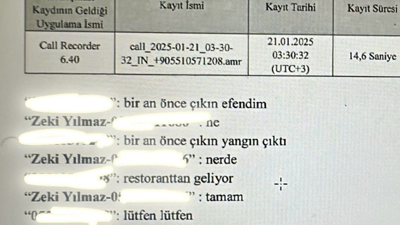 Zeki Yılmaz’ın telefon dökümünde 21 Ocak gecesi saat 03.30’da otel yetkilileri ile 14.6 saniyelik görüşme yaptığı ve otel yetkililerine ‘Bir an önce çıkın efendim. Bir an önce çıkın yangın çıktı. Restorandan geliyor. Lütfen lütfen” şeklindeki konuşması da dava dosyasında yer aldı. (DHA)