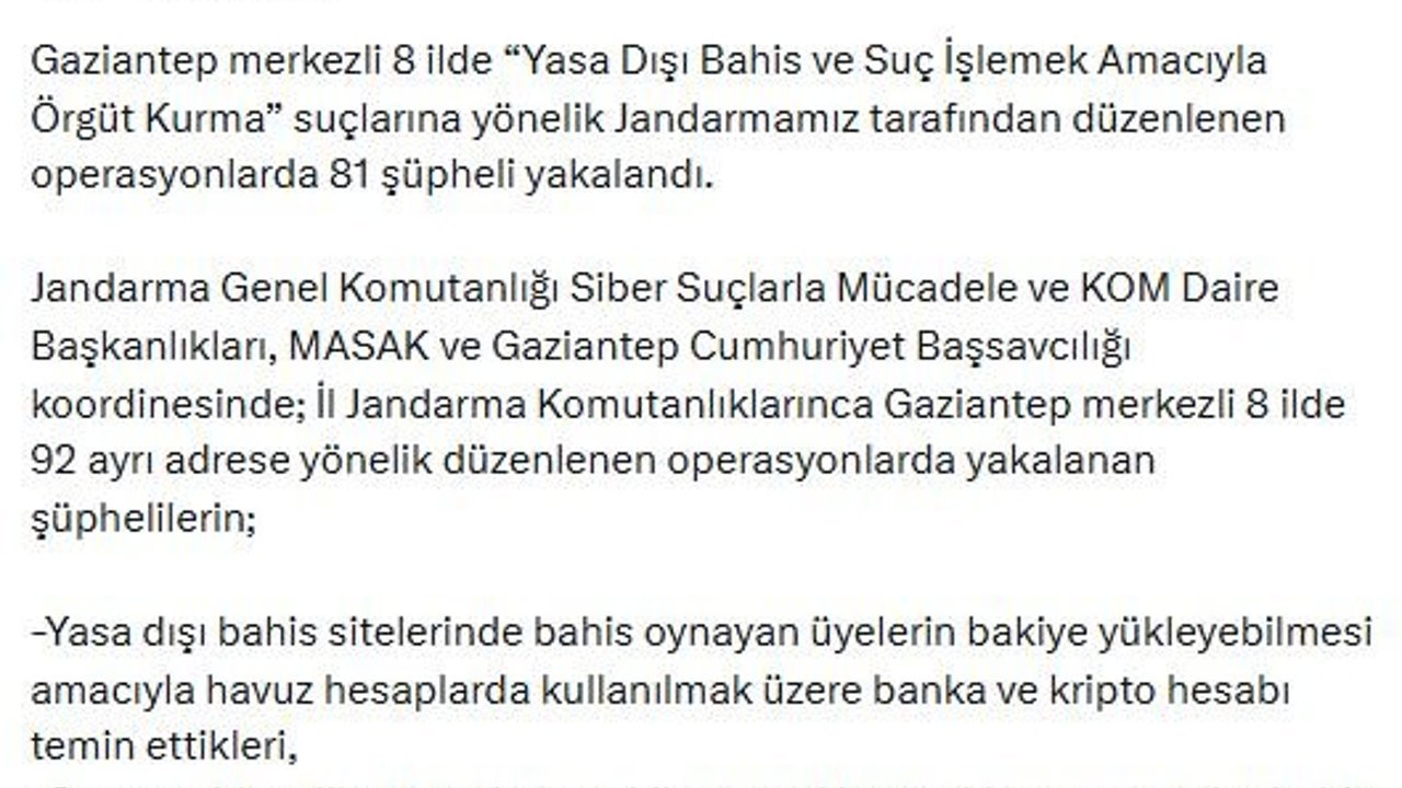 Bakanlığın sanal medya hesabından yapılan açıklamaya göre; jandarma, MASAK ve Gaziantep Cumhuriyet Başsavcılığı koordinesinde 92 adreste düzenlenen operasyonlarda 81 şüpheli yakalandı. Şüphelilerin; yasa dışı bahis sitelerinde bahis oynayan üyelerin bakiye yükleyebilmesi amacıyla havuz hesaplarda kullanılmak üzere banka ve kripto hesabı temin ettikleri, suçtan elde edilen tutarların nakline aracılık yaptıkları ve yasa dışı bahis oynattıkları tespit edildi. MASAK incelemesi sonucu şüphelilere ait; 254 banka ve 121 kripto hesabında toplam 50 milyar TL para hareketinin olduğu tespit edildi. (DHA)