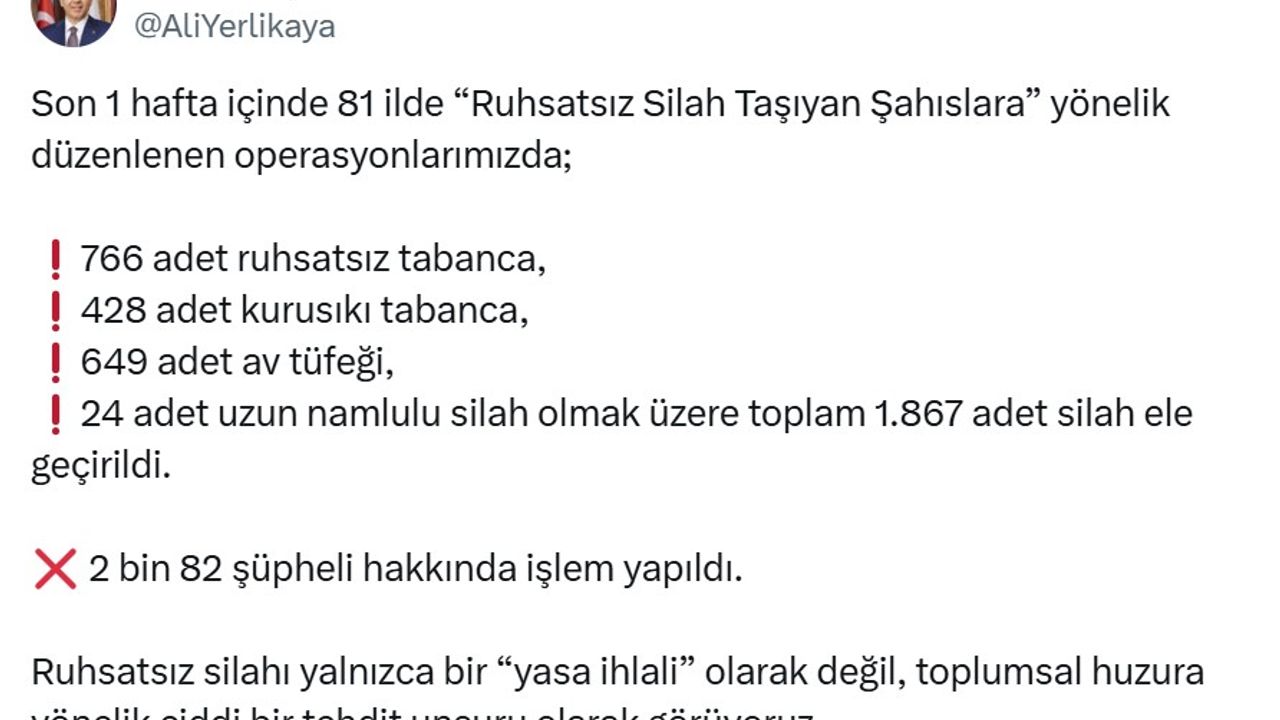 İçişleri Bakanı Ali Yerlikaya, son 1 hafta içinde 81 ilde polis ve jandarma tarafından ruhsatsız silah taşıyan kişilere yönelik düzenlenen operasyonu sosyal medya hesabından paylaştı. Buna göre; 766 ruhsatsız tabanca, 428 kurusıkı tabanca, 649 av tüfeği, 24 uzun namlulu silah olmak üzere toplam 1867 silah ele geçirildi. 2 bin 82 şüpheli hakkında işlem yapıldı.