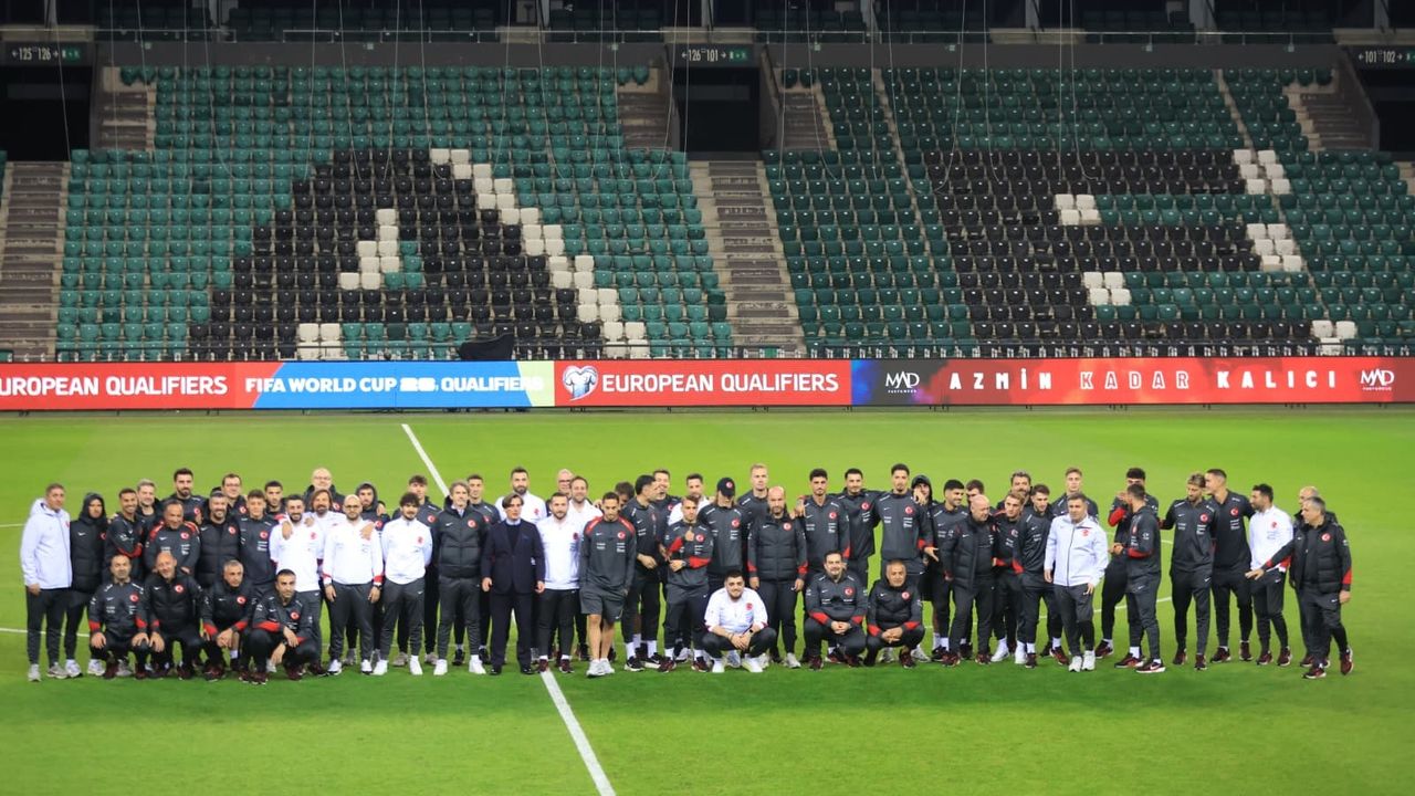 Türkiye A Milli Futbol Takımı, 2026 Dünya Kupası Elemeleri E Grubu 4’üncü maçında yarın saat 21.45’de Kocaeli Stadyumu’nda, Gürcistan’ı konuk edecek. A Milli Takım Teknik Direktörü Vincenzo Montella ile Kerem Aktürkoğlu basın toplantısının ardından diğer futbolcular ile yeşil zemine çıktı. Türkiye’nin Bulgaristan’ı 6-1 mağlup ettiği karşılaşmada 100’üncü kez milli formayı giyerek ‘dalya’ diyen takım kaptanı Hakan Çalhanoğlu için orta sahada pasta kesildi. Türkiye Futbol Federasyonu (TFF) Başkanı İbrahim Hacıosmanoğlu, pasta dilimini eliyle Çalhanoğlu’na ikram etti. Kocaeli Valisi İlhami Aktaş ve Kocaeli Büyükşehir Belediye Başkanı Tahir Büyükakın ise Çalhanoğlu’na çiçek taktim etti. Takım arkadaşları Çalhanoğlu'nun sevincine eşlik edip, kaptanlarını kutladı. Futbolcular daha sonra basın mensuplarıyla anı fotoğraf çektirdi. (DHA)