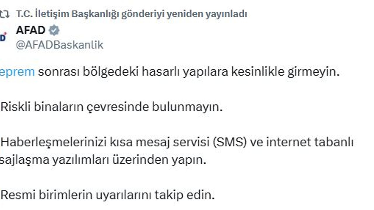 AFAD'ın sosyal medya hesabından yapılan açıklamada, "Deprem sonrası bölgedeki hasarlı yapılara kesinlikle girmeyin. Riskli binaların çevresinde bulunmayın. Haberleşmelerinizi kısa mesaj servisi (SMS) ve internet tabanlı mesajlaşma yazılımları üzerinden yapın. Resmi birimlerin uyarılarını takip edin" denildi.