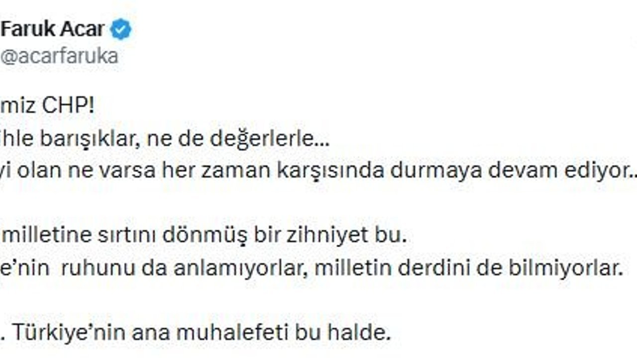 AK Parti'li Faruk Acar ise sanal medya hesabından, 'Bildiğimiz CHP; ne tarihle barışıklar, ne de değerlerle. CHP, iyi olan ne varsa her zaman karşısında durmaya devam ediyor. Kendi milletine sırtını dönmüş bir zihniyet bu. Türkiye'nin ruhunu da anlamıyorlar, milletin derdini de bilmiyorlar. Yazık, Türkiye'nin ana muhalefeti bu halde' açıklaması yaptı. (DHA)