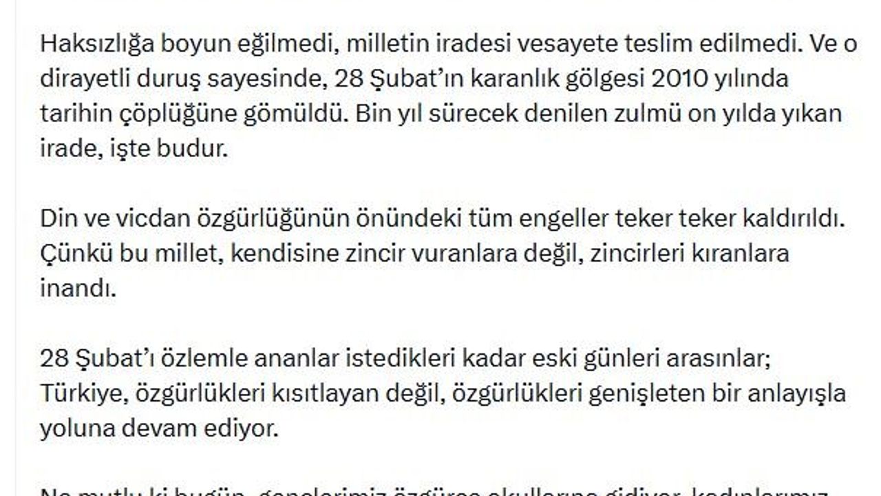 Efkan Ala, sanal medya hesabından yaptığı açıklamada, 'O dönemde, 'bin yıl sürecek' denilen zulüm düzeni, sadece siyaseti değil, sokakta yaşayan insanımızın inancını, kıyafetini, vicdanını da hedef aldı. İşte tam da bu karanlık tablonun ortasında, Sayın Recep Tayyip Erdoğan ve onun ardında yürüyen milyonlar dimdik ayakta durdu. Haksızlığa boyun eğilmedi, milletin iradesi vesayete teslim edilmedi. Ve o dirayetli duruş sayesinde, 28 Şubat'ın karanlık gölgesi 2010 yılında tarihin çöplüğüne gömüldü. Bin yıl sürecek denilen zulmü on yılda yıkan irade, işte budur. Din ve vicdan özgürlüğünün önündeki tüm engeller teker teker kaldırıldı. Çünkü bu millet, kendisine zincir vuranlara değil, zincirleri kıranlara inandı. 28 Şubat'ı özlemle ananlar istedikleri kadar eski günleri arasınlar; Türkiye, özgürlükleri kısıtlayan değil, özgürlükleri genişleten bir anlayışla yoluna devam ediyor. Ne mutlu ki bugün, gençlerimiz özgürce okullarına gidiyor, kadınlarımız başı dik bir şekilde iş hayatında yer alıyor, inancını yaşamak isteyen hiç kimsenin önünde bir engel bulunmuyor. Çünkü bu topraklarda artık, milletin iradesi hüküm sürüyor' ifadelerini kullandı. (DHA)