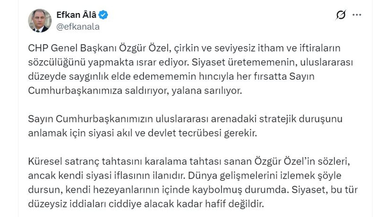 ANKARA, (DHA)- AK Parti Genel Başkan Vekili Efkan Ala, CHP Genel Başkanı Özgür Özel'in Cumhurbaşkanı Recep Tayyip Erdoğan'a yönelik sözleriyle ilgili, 'Küresel satranç tahtasını karalama tahtası sanan Özgür Özel'in sözleri, ancak kendi siyasi iflasının ilanıdır' dedi.