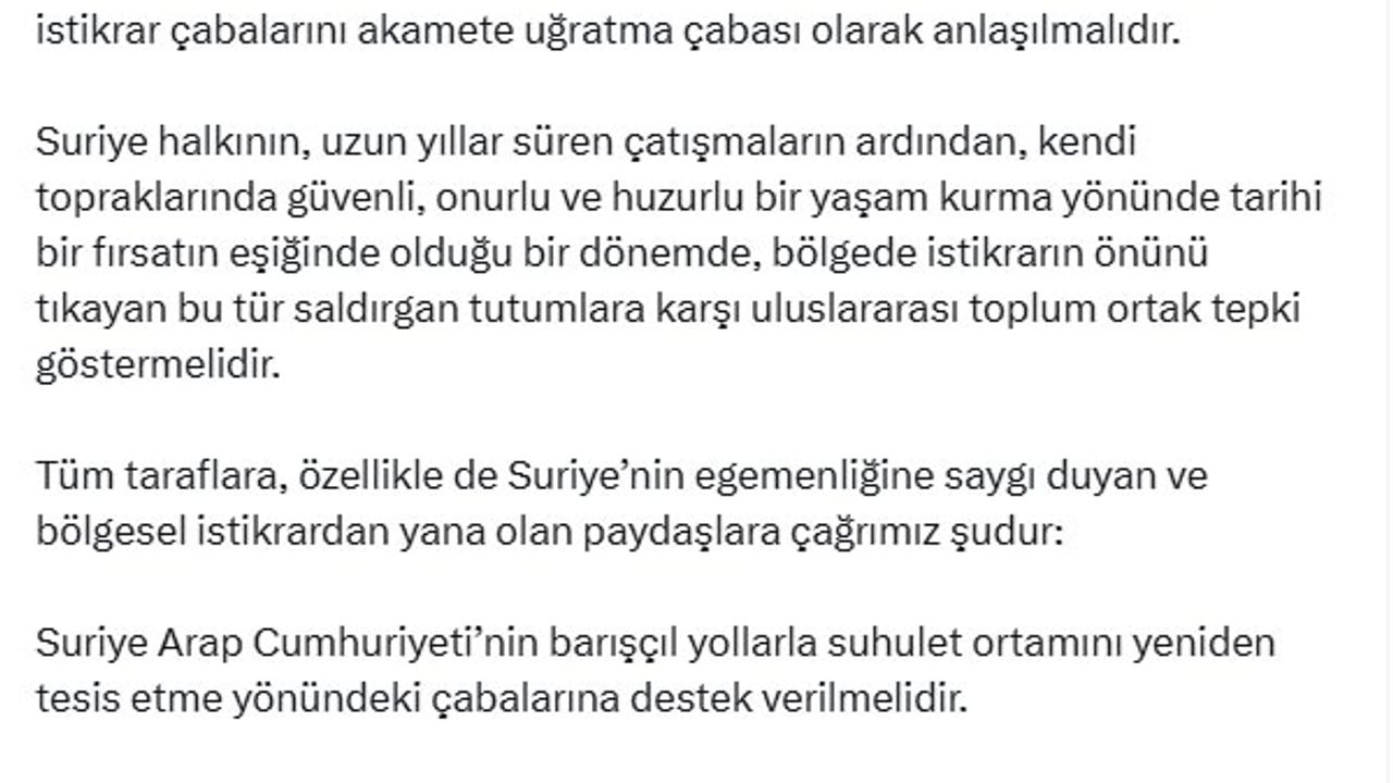 AK Parti'li Ala, sosyal medya hesabından yaptığı açıklamada, "Suriye’nin toprak bütünlüğüne ve barış içinde yaşama hakkına yönelik her türlü saldırı, bölgesel ve küresel istikrarın geleceğine yönelmiş bir tehdittir. Son günlerde İsrail’in Suriye’ye yönelik gerçekleştirdiği ve uluslararası hukuka açıkça aykırı olan saldırıları; bölgesel güvenliğin yanında barış ve istikrar çabalarını akamete uğratma çabası olarak anlaşılmalıdır. Suriye halkının, uzun yıllar süren çatışmaların ardından, kendi topraklarında güvenli, onurlu ve huzurlu bir yaşam kurma yönünde tarihi bir fırsatın eşiğinde olduğu bir dönemde, bölgede istikrarın önünü tıkayan bu tür saldırgan tutumlara karşı uluslararası toplum ortak tepki göstermelidir. Tüm taraflara, özellikle de Suriye’nin egemenliğine saygı duyan ve bölgesel istikrardan yana olan paydaşlara çağrımız şudur; Suriye Arap Cumhuriyeti’nin barışçıl yollarla suhulet ortamını yeniden tesis etme yönündeki çabalarına destek verilmelidir. Uluslararası hukuk, Birleşmiş Milletler Sözleşmesi ve devletlerin egemen eşitliği ilkesi temelinde, bölgede kalıcı barış ve güvenliğin sağlanması, müdahaleci ve saldırgan yaklaşımlardan uzak durulmasıyla mümkündür. Türkiye olarak Suriye’nin ve bölgenin istikrarına katkıda bulunmaya devam edeceğiz" ifadelerini kullandı. (DHA)