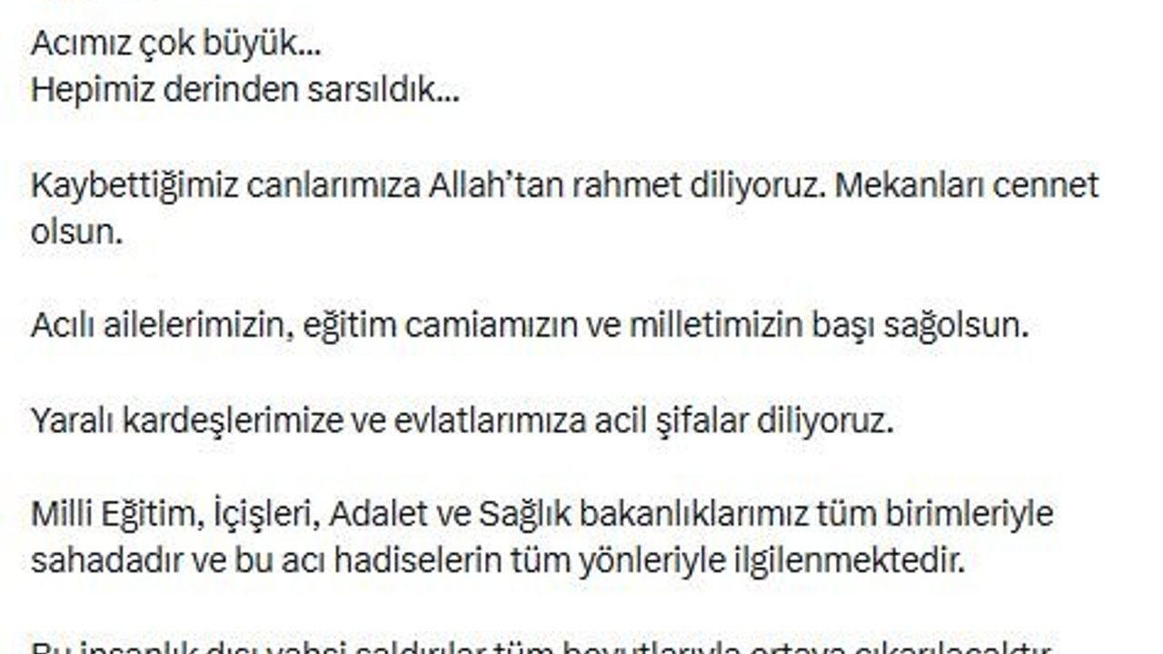 AK Parti'li Çelik, sanal medya hesabından yaptığı açıklamada, 'Acımız çok büyük, hepimiz derinden sarsıldık. Kaybettiğimiz canlarımıza Allah'tan rahmet diliyoruz. Mekanları cennet olsun. Acılı ailelerimizin, eğitim camiamızın ve milletimizin başı sağ olsun. Yaralı kardeşlerimize ve evlatlarımıza acil şifalar diliyoruz. Milli Eğitim, İçişleri, Adalet ve Sağlık Bakanlıklarımız tüm birimleriyle sahadadır ve bu acı hadiselerin tüm yönleriyle ilgilenmektedir. Bu insanlık dışı vahşi saldırılar tüm boyutlarıyla ortaya çıkarılacaktır' dedi. (DHA)