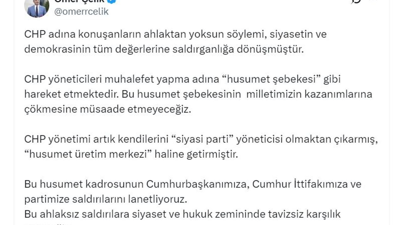 AK Parti Sözcüsü Çelik, sosyal medya hesabından yaptığı açıklamada, "CHP adına konuşanların ahlaktan yoksun söylemi, siyasetin ve demokrasinin tüm değerlerine saldırganlığa dönüşmüştür. CHP yöneticileri muhalefet yapma adına 'husumet şebekesi' gibi hareket etmektedir. Bu husumet şebekesinin milletimizin kazanımlarına çökmesine müsaade etmeyeceğiz. CHP yönetimi artık kendilerini 'siyasi parti' yöneticisi olmaktan çıkarmış, 'husumet üretim merkezi' haline getirmiştir. Bu husumet kadrosunun Cumhurbaşkanımıza, Cumhur İttifakımıza ve partimize saldırılarını lanetliyoruz. Bu ahlaksız saldırılara siyaset ve hukuk zemininde tavizsiz karşılık vereceğiz" ifadelerini kullandı. (DHA)