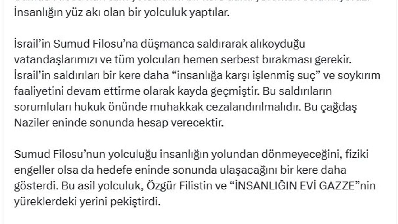 AK Parti Sözcüsü Ömer Çelik, sosyal medya hesabından yaptığı açıklamada, "Sumud Filosu’nun tüm yolcularını bir kere daha yürekten selamlıyoruz. İnsanlığın yüz akı olan bir yolculuk yaptılar. İsrail’in Sumud Filosu’na düşmanca saldırarak alıkoyduğu vatandaşlarımızı ve tüm yolcuları hemen serbest bırakması gerekir. İsrail’in saldırıları bir kere daha insanlığa karşı işlenmiş suç ve soykırım faaliyetini devam ettirme olarak kayda geçmiştir. Bu saldırıların sorumluları hukuk önünde muhakkak cezalandırılmalıdır. Bu çağdaş Naziler eninde sonunda hesap verecektir. Sumud Filosu’nun yolculuğu insanlığın yolundan dönmeyeceğini, fiziki engeller olsa da hedefe eninde sonunda ulaşacağını bir kere daha gösterdi. Bu asil yolculuk, özgür Filistin ve insanlığın evi Gazze'nin yüreklerdeki yerini pekiştirdi. Gazze için mücadele edenlerin yolu ve yolculuğu mübarek olsun" ifadelerini kullandı. (DHA)
