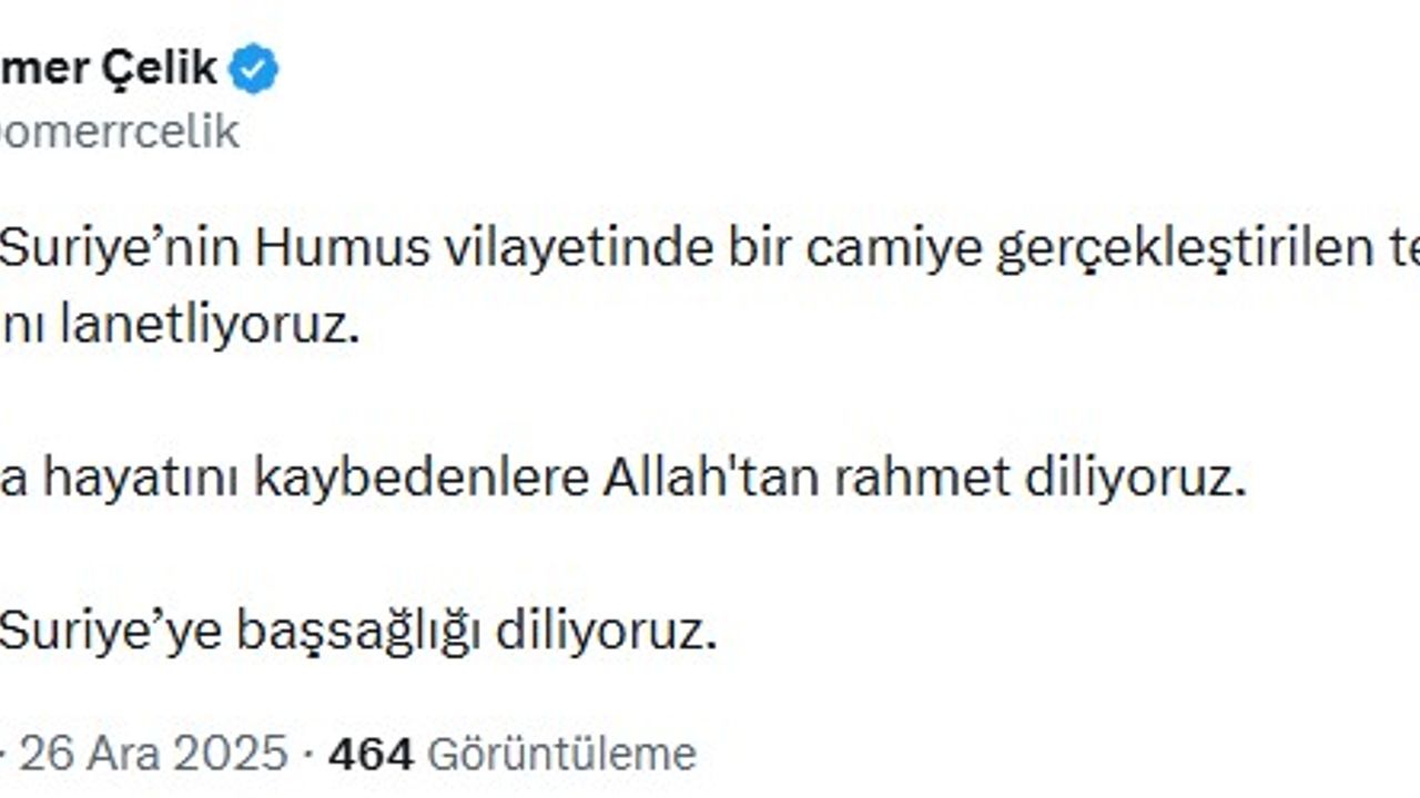 AK Parti Sözcüsü Ömer Çelik, sanal medya hesabından yaptığı paylaşımda, 'Kardeş Suriye'nin Humus vilayetinde bir camiye gerçekleştirilen terör saldırısını lanetliyoruz. Saldırıda hayatını kaybedenlere Allah'tan rahmet diliyoruz. Kardeş Suriye'ye başsağlığı diliyoruz' ifadelerini kullandı. (DHA)