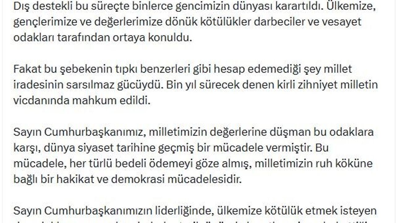 Ömer Çelik, sanal medya hesabından yaptığı açıklamada, 'Tüm darbe ve postmodern darbeler bu ülkeye ve milletimize karşı yapılmış kötülüklerdir. Millet iradesini hedef alan tüm girişim ve müdahaleler millete düşmanlıktır. Aynı şekilde 28 Şubat postmodern darbesi denilen millet düşmanı girişim de ülkemize dönük bir kötülük ve düşmanlık projesiydi. 28 Şubat, değerlerimize düşmanca bakan saldırgan ve vahşi bir projeydi. Dış destekli bu süreçte binlerce gencimizin dünyası karartıldı. Ülkemize, gençlerimize ve değerlerimize dönük kötülükler darbeciler ve vesayet odakları tarafından ortaya konuldu. Fakat bu şebekenin tıpkı benzerleri gibi hesap edemediği şey millet iradesinin sarsılmaz gücüydü. Bin yıl sürecek denen kirli zihniyet milletin vicdanında mahkum edildi. Sayın Cumhurbaşkanımız, milletimizin değerlerine düşman bu odaklara karşı, dünya siyaset tarihine geçmiş bir mücadele vermiştir. Bu mücadele, her türlü bedeli ödemeyi göze almış, milletimizin ruh köküne bağlı bir hakikat ve demokrasi mücadelesidir. Sayın Cumhurbaşkanımızın liderliğinde, ülkemize kötülük etmek isteyen dış odakların aracı olan darbeler tarih önünde lanetlenmiş ve hak ettiği karşılığı bulmuştur. Cumhurbaşkanımızın liderliğinde güçlü bir mücadeleyle milli iradeye karşı olan tüm uygulamaları ortadan kaldırdık. Cumhurbaşkanımızın hayatı boyunca verdiği bu mücadele, milli egemenlik ve demokrasi mücadelesidir. Ülkemizin temel değerlerine, Cumhuriyete, demokrasiye, meşru siyasete ve millet iradesine kötülük peşinde koşanların cevabı tarih önünde verilmiştir. Egemenlik kayıtsız şartsız milletindir' ifadelerini kullandı. (DHA)