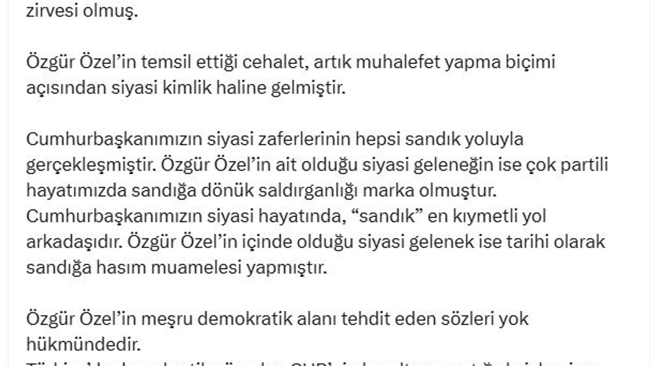 AK Parti'li Ömer Çelik, sosyal medya hesabından yaptığı açıklamada, "CHP Genel Başkanı Özgür Özel'in saygısız bir üslupla Cumhurbaşkanımızın sandıktan korktuğunu söylemesi, siyasi cehaletin zirvesi olmuş. Özgür Özel'in temsil ettiği cehalet, artık muhalefet yapma biçimi açısından siyasi kimlik haline gelmiştir. Cumhurbaşkanımızın siyasi zaferlerinin hepsi sandık yoluyla gerçekleşmiştir. Özgür Özel'in ait olduğu siyasi geleneğin ise çok partili hayatımızda sandığa dönük saldırganlığı marka olmuştur. Cumhurbaşkanımızın siyasi hayatında, sandık en kıymetli yol arkadaşıdır. Özgür Özel'in içinde olduğu siyasi gelenek ise tarihi olarak sandığa hasım muamelesi yapmıştır. Özgür Özel'in meşru demokratik alanı tehdit eden sözleri yok hükmündedir. Türkiye'de demokratik süreçler, CHP'nin kurultay mantığıyla işlemiyor. Özgür Özel'in CHP'nin kurultay mantığıyla, demokrasinin aynı şey olmadığını anlaması kendine yapacağı en büyük iyiliktir" ifadelerini kullandı. (DHA)