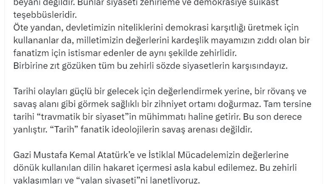 AK Parti Sözcüsü Ömer Çelik, sosyal medya hesabında yaptığı açıklamada, "Siyasi fikir ifade etmekle, siyaseti ve demokrasiyi zehirlemek aynı şey değildir. Devletimizin niteliklerine ve milletimizin değerlerine dönük saldırgan ve hakaretamiz söylem ve eylemler 'siyasi tartışma' ya da siyasi fikir beyanı değildir. Bunlar siyaseti zehirleme ve demokrasiye suikast teşebbüsleridir. Öte yandan, devletimizin niteliklerini demokrasi karşıtlığı üretmek için kullananlar da milletimizin değerlerini kardeşlik mayamızın zıddı olan bir fanatizm için istismar edenler de aynı şekilde zehirlidir. Birbirine zıt gözüken tüm bu zehirli sözde siyasetlerin karşısındayız. Tarihi olayları güçlü bir gelecek için değerlendirmek yerine, bir rövanş ve savaş alanı gibi görmek sağlıklı bir zihniyet ortamı doğurmaz. Tam tersine tarihi travmatik bir siyasetin mühimmatı haline getirir. Bu son derece yanlıştır. Tarih, fanatik ideolojilerin savaş arenası değildir. Gazi Mustafa Kemal Atatürk’e ve İstiklal Mücadelemizin değerlerine dönük kullanılan dilin hakaret içermesi asla kabul edilemez. Bu zehirli yaklaşımları ve yalan siyasetini lanetliyoruz" dedi.