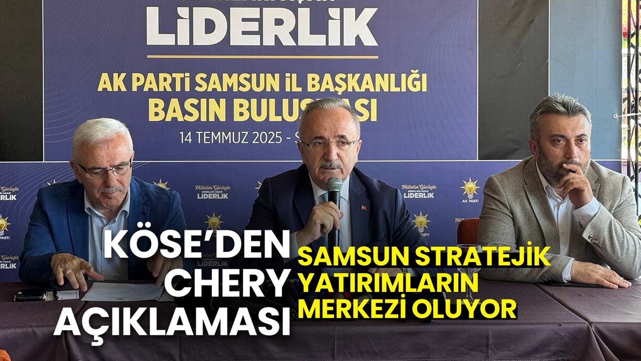 AK Parti Samsun İl Başkanı Mehmet Köse, İlkadım’daki Ihlamur Kafe’de gerçekleştirdiği basın toplantısında, Çinli otomobil devi Chery’nin Samsun’a yapacağı fabrika yatırımı, savunma sanayi projeleri ve PKK’nın silah bırakma süreci ile ilgili değerlendirmelerde bulundu.
