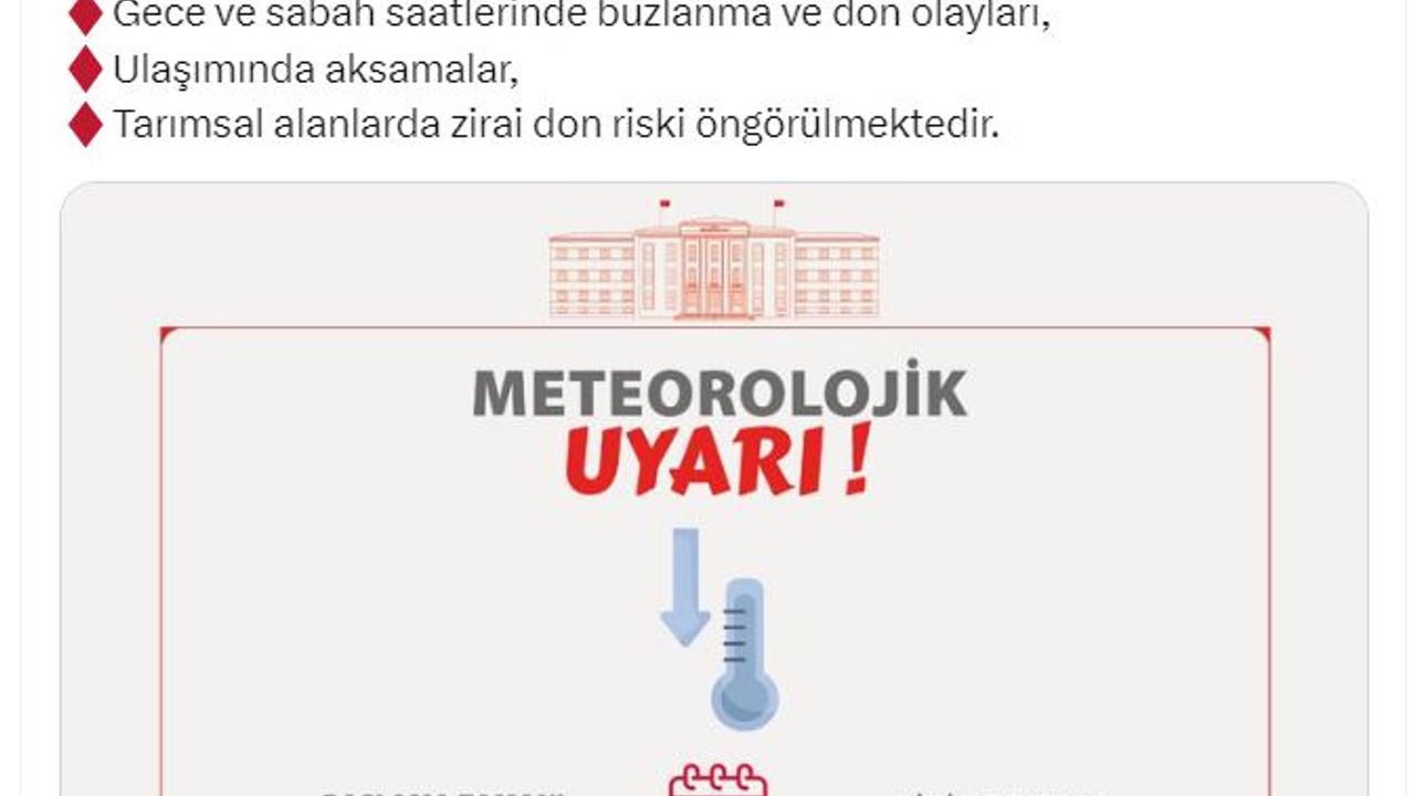 Valiliğin sosyal medya hesabından yapılan açıklamada, 'Meteoroloji Genel Müdürlüğü Analiz ve Tahmin Merkezinden alınan son verilere göre; halen mevsim normalleri civarında seyreden hava sıcaklıklarının, Ankara genelinde hissedilir derecede (6 ila 10 derece) azalacağı ve soğuk havanın Ankara genelinde önümüzdeki hafta boyunca da etkisini sürdürmesi beklenmektedir. Ankara il merkezinde; 26 Aralık 2025 ile 2 Ocak 2026 tarihleri arasındaki en düşük hava sıcaklığının eksi 3 dereceye kadar düşeceği tahmin edilmektedir. Bu süreçte; özellikle gece ve sabah saatlerinde sıcaklıkların düşmesine bağlı olarak buzlanma ve don olaylarının görülebileceği, buna bağlı olarak kara ve hava ulaşımında aksamalar yaşanabileceği, ayrıca tarımsal faaliyetlerin devam ettiği bölgelerde soğuk hava ve don olaylarının zirai don riskini artıracağı, ürün kayıplarına neden olabileceği öngörülmektedir' denildi. (DHA)