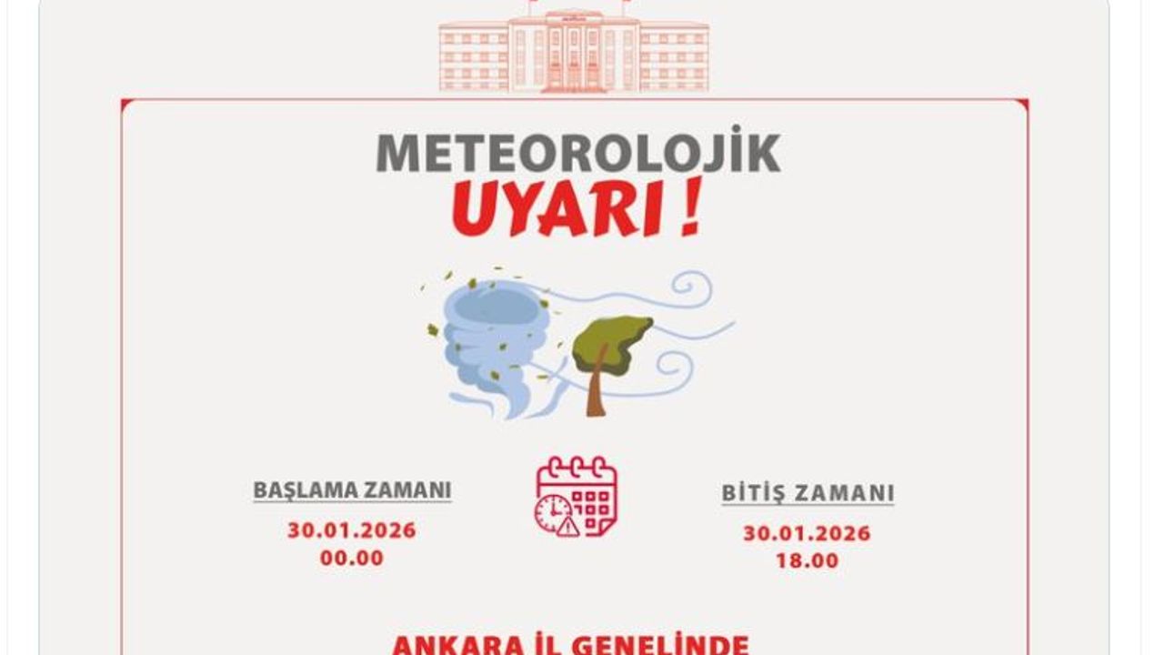 Valiliğin sanal medya hesabından yapılan açıklamada, 'Meteoroloji Genel Müdürlüğü Analiz ve Tahmin Merkezinden alınan son verilere göre; rüzgarın, yarın (30.01.2026 Cuma) Ankara il genelinde güney yönlerden kuvvetli rüzgar ve yer yer fırtına (40-60 kilometre/saat, yükseklerde 60-80 kilometre/saat) şeklinde esmesi beklenmektedir. Kuvvetli rüzgarla birlikte ulaşımda aksamalar, çatı uçması, ağaç devrilmesi, soba ve doğal gaz kaynaklı baca gazı zehirlenmesi gibi olumsuzluklara karşı dikkatli ve tedbirli olunmalıdır' denildi. (DHA)