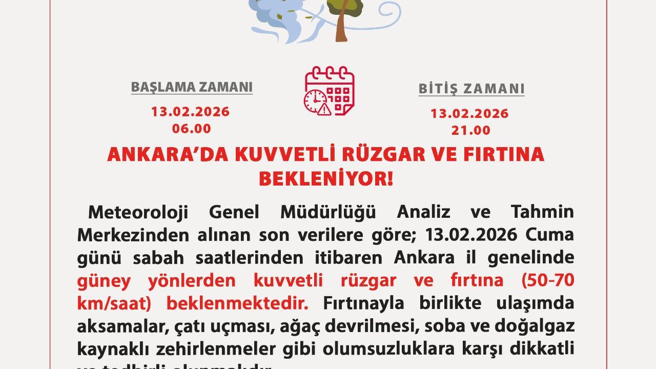 Ankara Valiliği'nin sanal medya hesabından yapılan açıklamada, 'Meteoroloji Genel Müdürlüğü Analiz ve Tahmin Merkezinden alınan son verilere göre; 13 Şubat 2026 Cuma günü sabah saatlerinden itibaren Ankara il genelinde güney yönlerden kuvvetli rüzgar ve fırtına (50-70 kilometre/saat) beklenmektedir. Fırtınayla birlikte ulaşımda aksamalar, çatı uçması, ağaç devrilmesi, soba ve doğal gaz kaynaklı zehirlenmeler gibi olumsuzluklara karşı dikkatli ve tedbirli olunmalıdır' denildi. (DHA)