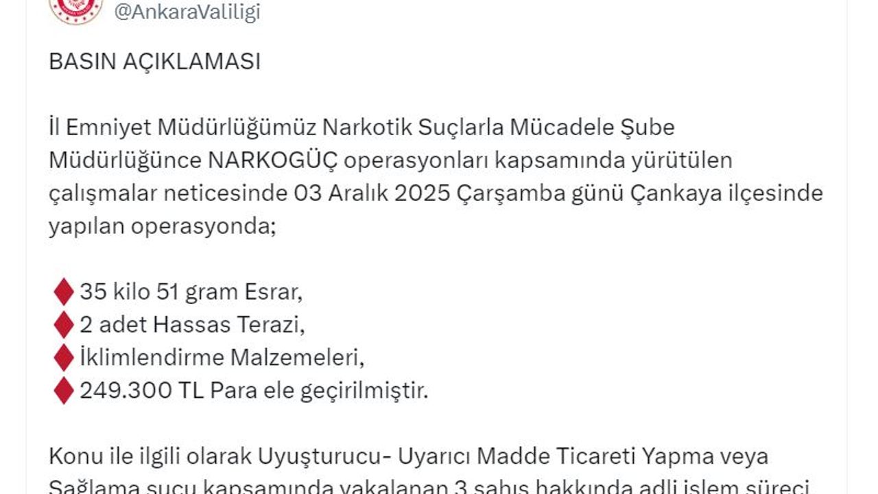 Valiliğin sosyal medya hesabından yapılan açıklamada, "İl Emniyet Müdürlüğümüz Narkotik Suçlarla Mücadele Şube Müdürlüğünce Narkogüç operasyonları kapsamında, yürütülen çalışmalar neticesinde 3 Aralık 2025 Çarşamba günü Çankaya ilçesinde yapılan operasyonda; 35 kilo 51 gram esrar, 2 hassas terazi, iklimlendirme malzemeleri, 249 bin 300 TL para ele geçirilmiştir. Konuyla ilgili olarak 'Uyuşturucu- uyarıcı madde ticareti yapma veya sağlama' suçu kapsamında yakalanan 3 şahıs hakkında adli işlem süreci devam etmektedir" denildi.