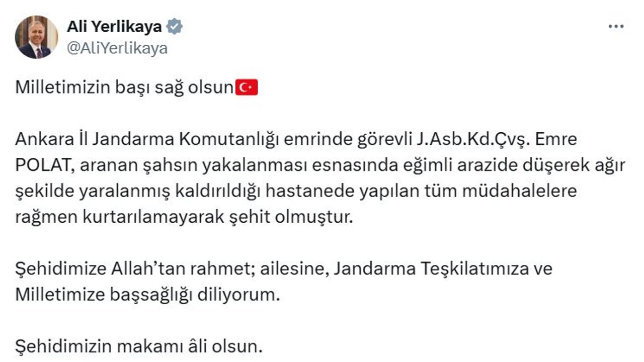 ANKARA, (DHA)- İÇİŞLERİ Bakanı Ali Yerlikaya, Ankara'da araması olan kişinin yakalanması sırasında eğimli arazide düşerek ağır yaralanan Jandarma Astsubay Kıdemli Çavuş Emre Polat'ın, kaldırıldığı hastanede şehit olduğunu duyurdu.