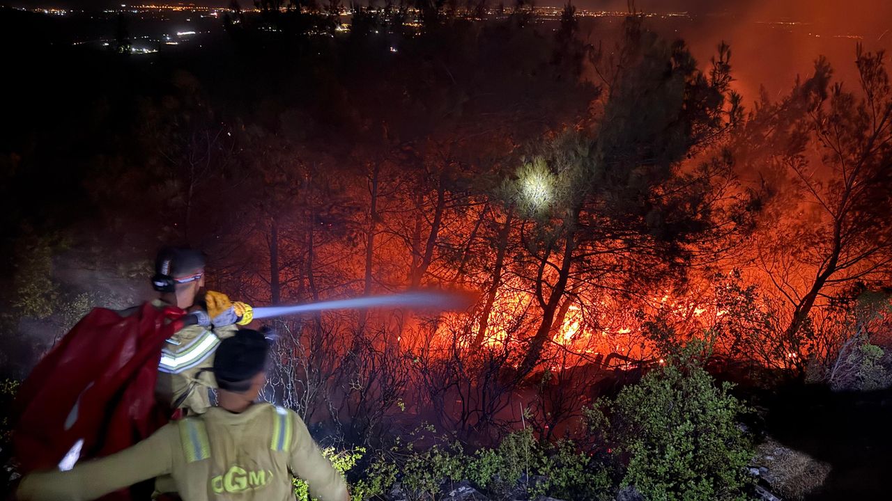 Aydın’ın Söke ilçesine bağlı Sazlıköy Mahallesi’nde saat 16.00 sıralarında makide çıkıp ormana sıçrayan yangında 10 saat geride kaldı. Alevlerin kontrol altına alınması için ekiplerin yoğun müdahalesi devam ediyor. (DHA)