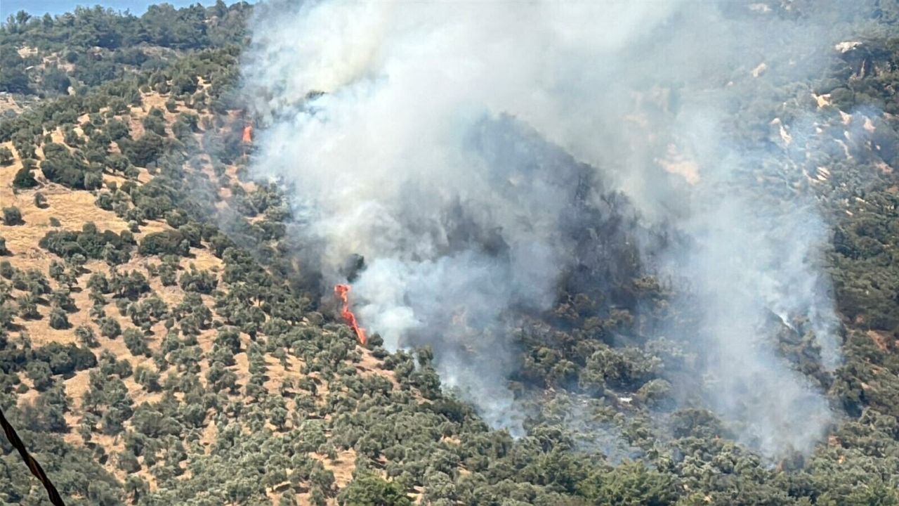 Melek FIRAT/AYDIN, (DHA)- AYDIN'da zeytin ağaçlarıyla kaplı tarım arazisinde yangın çıktı. Bölgeye sevk edilen ekipler, alevlere havadan ve karadan müdahale ediyor.