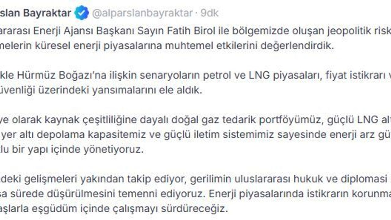 Enerji ve Tabii Kaynaklar Bakanı Alparslan Bayraktar, sanal medya hesabından açıklama yaptı. Bayraktar, Uluslararası Enerji Ajansı Başkanı Fatih Birol ile bölgede oluşan jeopolitik riskleri ve bu gelişmelerin küresel enerji piyasalarına muhtemel etkilerini değerlendirdiklerini bildirdi. Bayraktar, 'Özellikle Hürmüz Boğazı'na ilişkin senaryoların petrol ve LNG piyasaları, fiyat istikrarı ve küresel arz güvenliği üzerindeki yansımalarını ele aldık. Türkiye olarak kaynak çeşitliliğine dayalı doğal gaz tedarik portföyümüz, güçlü LNG altyapımız, artan yer altı depolama kapasitemiz ve güçlü iletim sistemimiz sayesinde enerji arz güvenliğini çok boyutlu bir yapı içinde yönetiyoruz. Bölgedeki gelişmeleri yakından takip ediyor, gerilimin uluslararası hukuk ve diplomasi zemininde en kısa sürede düşürülmesini temenni ediyoruz. Enerji piyasalarında istikrarın korunması için tüm paydaşlarla eşgüdüm içinde çalışmayı sürdüreceğiz' ifadelerini kullandı. (DHA)