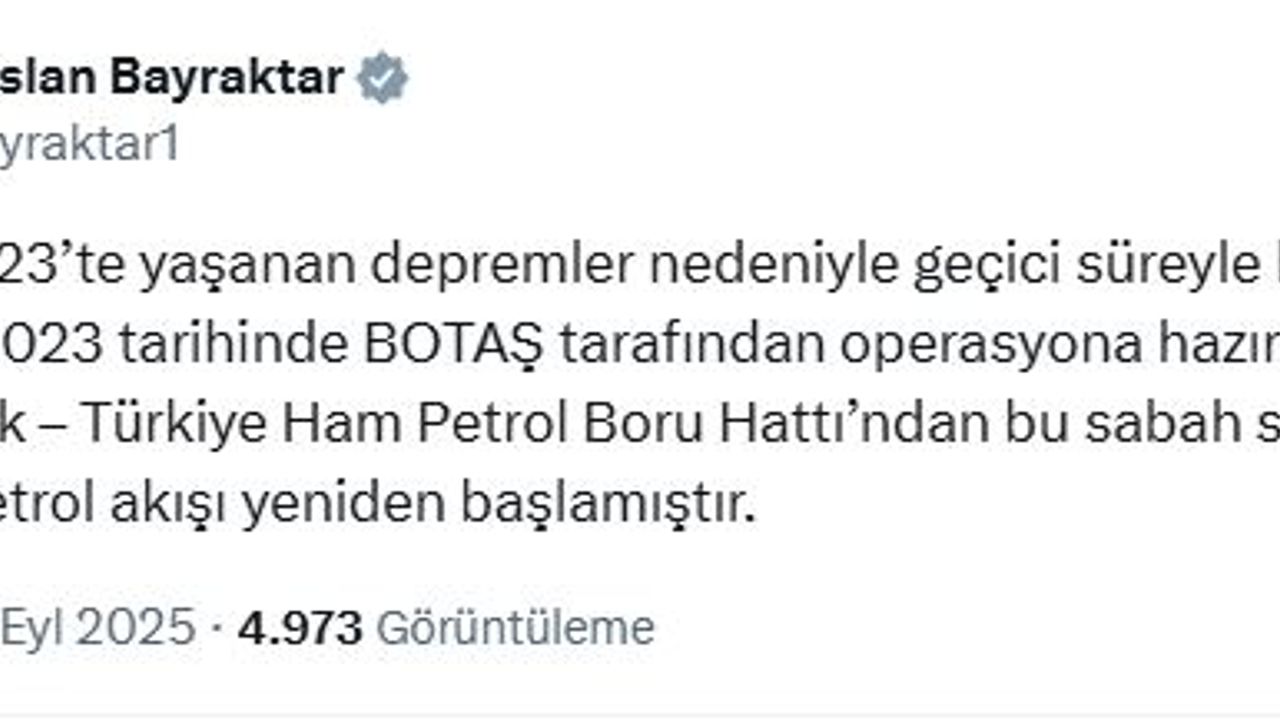 ANKARA, (DHA)- ENERJİ ve Tabii Kaynaklar Bakanı Alparslan Bayraktar, 6 Şubat depremlerinin ardından geçici süreyle kapalı kalan Irak-Türkiye ham petrol boru hattından petrol akışının yeniden başladığını duyurdu.
