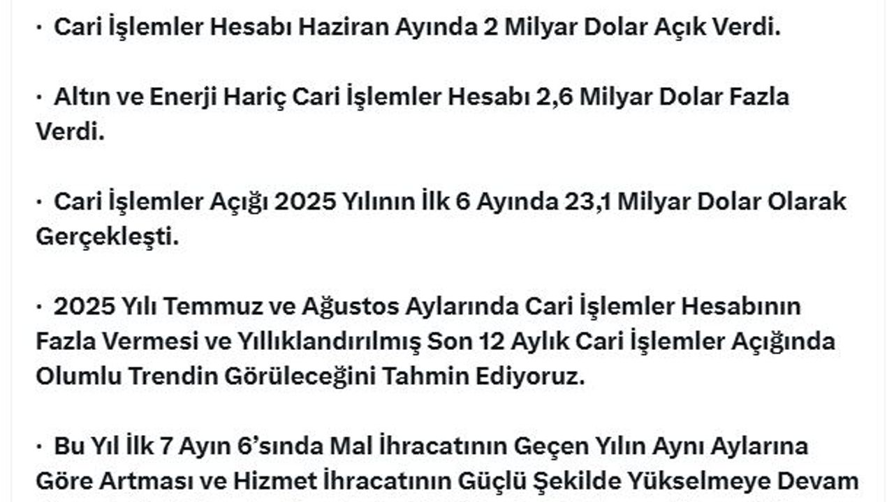 Ticaret Bakanı Ömer Bolat, haziran ayı ödemeler dengesi istatistiklerine ilişkin sosyal medya hesabından açıklama yaptı. Bakan Bolat, "Ekonomide yüz güldüren veriler gelmeye devam ediyor. Cari işlemler açığı haziranda, yıllıklandırılmış olarak, 18,9 milyar dolara geriledi. Geçen yıl bu açık 20,2 milyar dolar idi. Cari işlemler hesabı haziran ayında 2 milyar dolar açık verdi. Altın ve enerji hariç cari işlemler hesabı 2,6 milyar dolar fazla verdi. Cari işlemler açığı 2025 yılının ilk 6 ayında 23,1 milyar dolar olarak gerçekleşti. 2025 yılı Temmuz ve Ağustos aylarında cari işlemler hesabının fazla vermesi ve yıllıklandırılmış son 12 aylık cari işlemler açığında olumlu trendin görüleceğini tahmin ediyoruz. Bu yıl ilk 7 ayın 6'sında mal ihracatının geçen yılın aynı aylarına göre artması ve hizmet ihracatının güçlü şekilde yükselmeye devam etmesi, cari işlemler dengesindeki olumlu tablonun sürmesini sağlamaktadır" dedi.