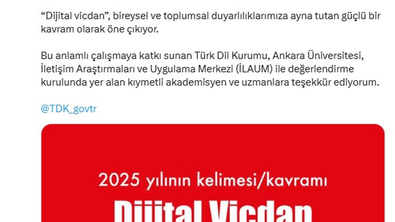 Bakan Mehmet Nuri Ersoy, sanal medya hesabından yaptığı açıklamada, TDK tarafından belirlenen 2025 yılının kelimesini duyurdu. Bakan Ersoy, 'Türk Dil Kurumu tarafından, halkın katılımıyla belirlenen 2025 yılının kelimesi/kavramı 'dijital vicdan' oldu. Yaklaşık 300 bin oyun kullanıldığı bu süreçte seçilen kavram; dijital çağda vicdanın, sorumluluk ve eylemden uzaklaşıp yalnızca bir 'tıklama'ya indirgenmesini düşündürücü bir biçimde tartışmaya açıyor. 'Dijital vicdan', bireysel ve toplumsal duyarlılıklarımıza ayna tutan güçlü bir kavram olarak öne çıkıyor. Bu anlamlı çalışmaya katkı sunan Türk Dil Kurumu, Ankara Üniversitesi İletişim Araştırmaları ve Uygulama Merkezi (İLAUM) ile değerlendirme kurulunda yer alan kıymetli akademisyen ve uzmanlara teşekkür ediyorum' ifadelerini kullandı.