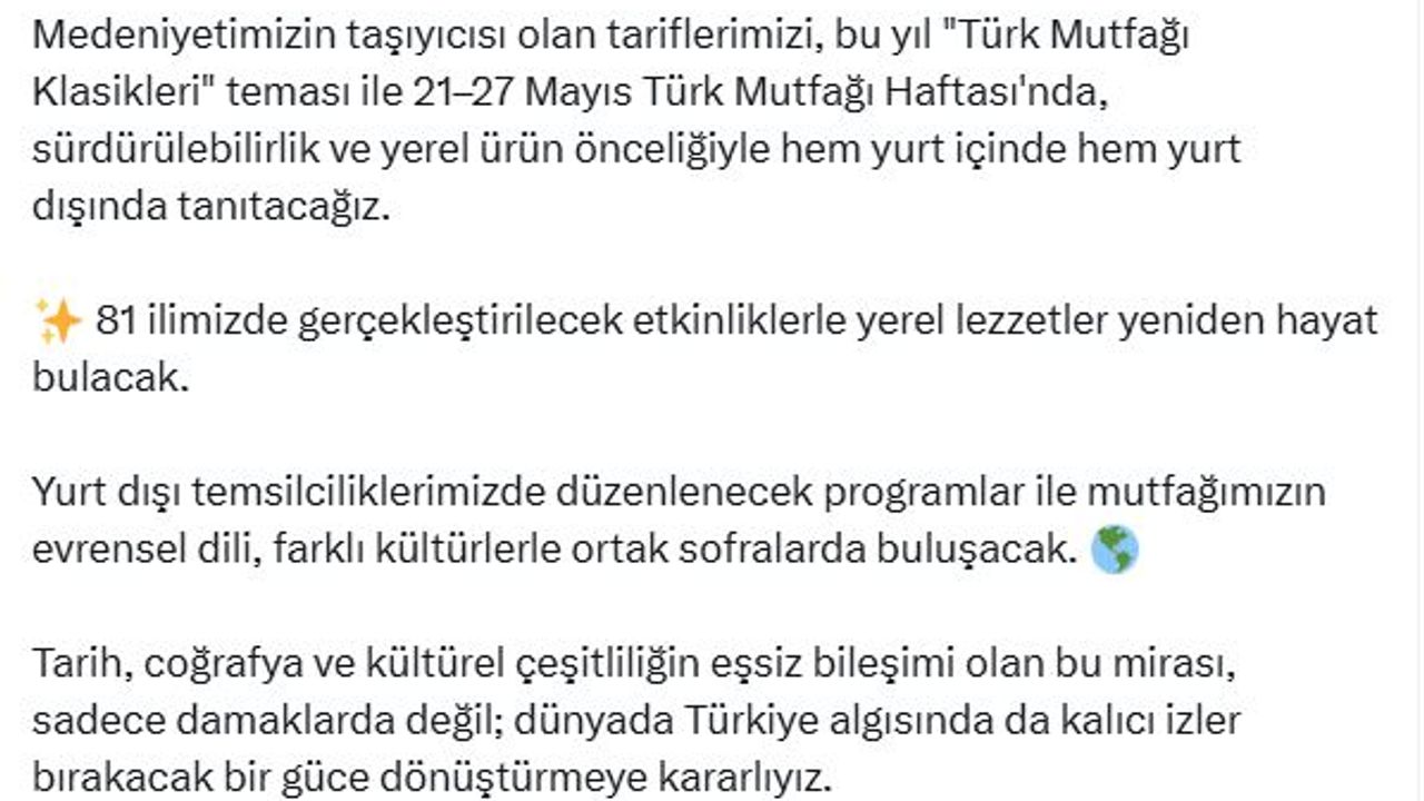 Kültür ve Turizm Bakanı Mehmet Nuri Ersoy, Türk Mutfağı Haftası ile ilgili sosyal medya hesabından yaptığı açıklamada, "Anadolu'nun ve dünyanın sofrası olan Türk mutfağı asırlardır toprağından ilhamla yoğrulan, el emeğiyle biçimlenen, kuşaktan kuşağa aktarılan bir kültür hazinesidir. Medeniyetimizin taşıyıcısı olan tariflerimizi, bu yıl 'Türk Mutfağı Klasikleri' teması ile 21-27 Mayıs Türk Mutfağı Haftası'nda, sürdürülebilirlik ve yerel ürün önceliğiyle hem yurt içinde hem yurt dışında tanıtacağız. 81 ilimizde gerçekleştirilecek etkinliklerle yerel lezzetler yeniden hayat bulacak. Yurt dışı temsilciliklerimizde düzenlenecek programlar ile mutfağımızın evrensel dili, farklı kültürlerle ortak sofralarda buluşacak" ifadelerini kullandı.