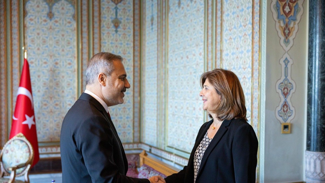 Dışişleri Bakanı Hakan Fidan, BM Genel Sekreteri'nin Kıbrıs Şahsi Temsilcisi María Angela Holguín ile İstanbul'da bir görüşme gerçekleştirdi. Basına kapalı gerçekleşen görüşmeye ilişkin fotoğraf paylaşıldı. (DHA)