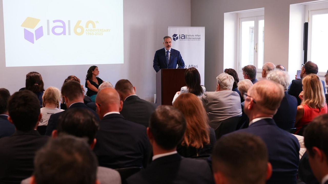 Bakan Fidan, resmi ziyaret kapsamında bulunduğu İtalya'da Roma Uluslararası İlişkiler Enstitüsü tarafından düzenlenen konferansta uluslararası gelişmeleri değerlendirdi. (DHA)
