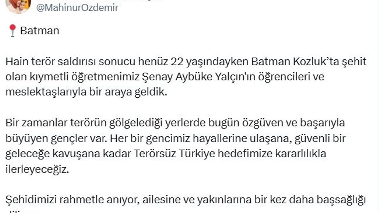 Aile ve Sosyal Hizmetler Bakanı Mahinur Özdemir Göktaş, sosyal medyada yaptığı paylaşımda, "Hain terör saldırısı sonucu henüz 22 yaşındayken Batman Kozluk'ta şehit olan kıymetli öğretmenimiz Şenay Aybüke Yalçın'ın öğrencileri ve meslektaşlarıyla bir araya geldik. Bir zamanlar terörün gölgelediği yerlerde bugün öz güven ve başarıyla büyüyen gençler var. Her bir gencimiz hayallerine ulaşana, güvenli bir geleceğe kavuşana kadar Terörsüz Türkiye hedefimize kararlılıkla ilerleyeceğiz. Şehidimizi rahmetle anıyor, ailesine ve yakınlarına bir kez daha başsağlığı diliyorum" ifadelerine yer verdi. (DHA)