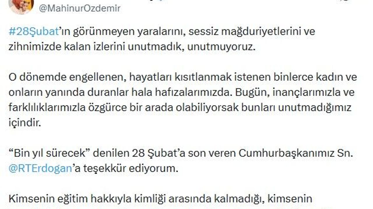 ANKARA, (DHA)- AİLE ve Sosyal Hizmetler Bakanı Mahinur Özdemir Göktaş, 28 Şubat'ın yıl dönümü mesajında, '28 Şubat'ın görünmeyen yaralarını, sessiz mağduriyetlerini ve zihnimizde kalan izlerini unutmadık, unutmuyoruz' dedi.