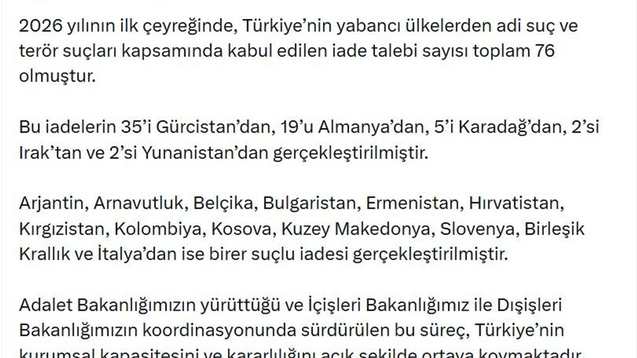ANKARA, (DHA)- ADALET Bakanı Akın Gürlek, '2026 yılının ilk çeyreğinde, Türkiye'nin yabancı ülkelerden adi suç ve terör suçları kapsamında kabul edilen iade talebi sayısı toplam 76 olmuştur' dedi.