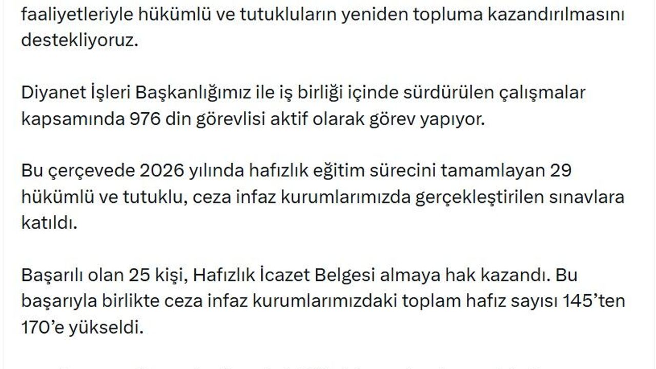 ANKARA, (DHA)- ADALET Bakanı Akın Gürlek, '2026 yılında hafızlık eğitim sürecini tamamlayan 29 hükümlü ve tutuklu, ceza infaz kurumlarımızda gerçekleştirilen sınavlara katıldı. Başarılı olan 25 kişi, Hafızlık İcazet Belgesi almaya hak kazandı. Bu başarıyla birlikte ceza infaz kurumlarımızdaki toplam hafız sayısı 145'ten 170'e yükseldi' dedi.
