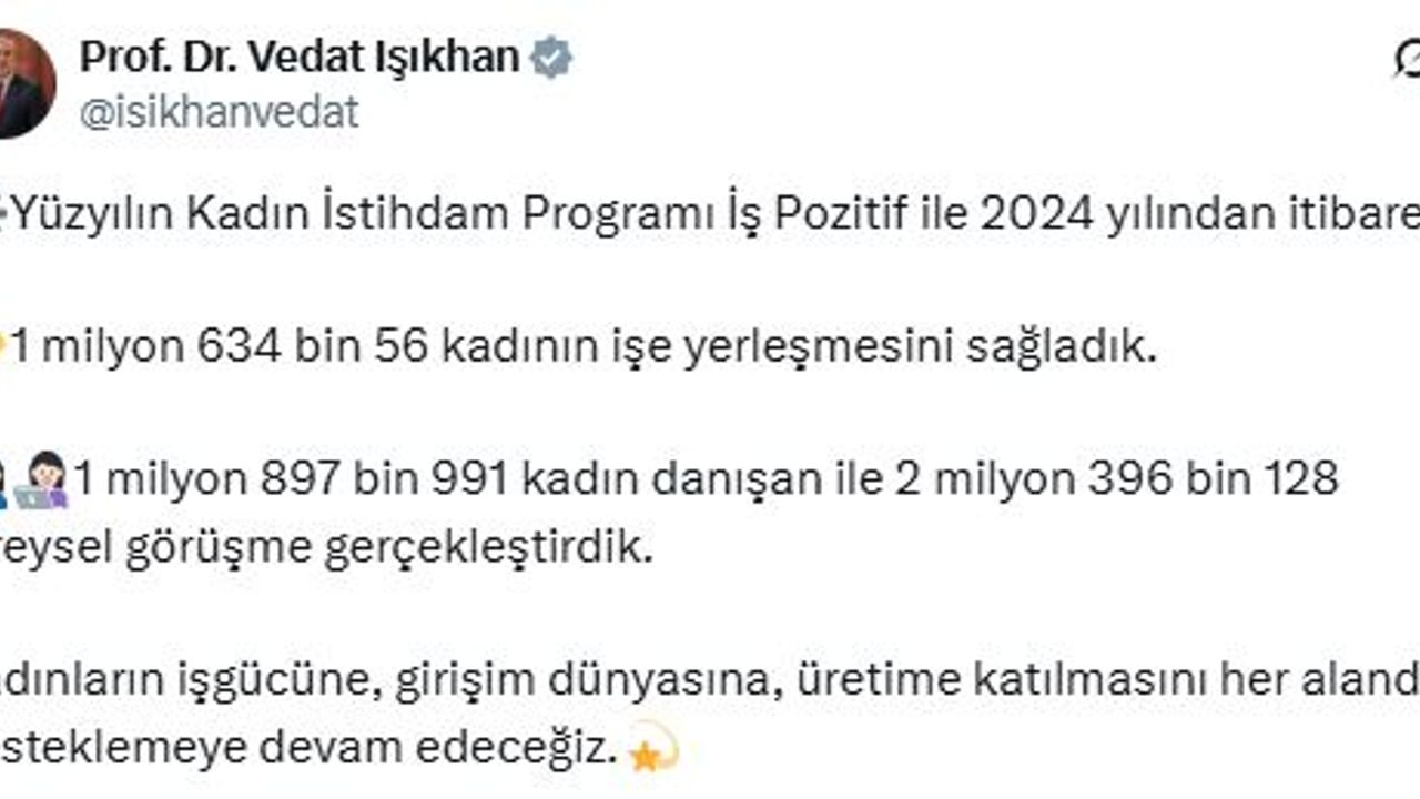 ANKARA, (DHA)- ÇALIŞMA ve Sosyal Güvenlik Bakanı Vedat Işıkhan, "Yüzyılın kadın istihdam programı İş Pozitif ile 2024 yılından itibaren 1 milyon 634 bin 56 kadının işe yerleşmesini sağladık" dedi.