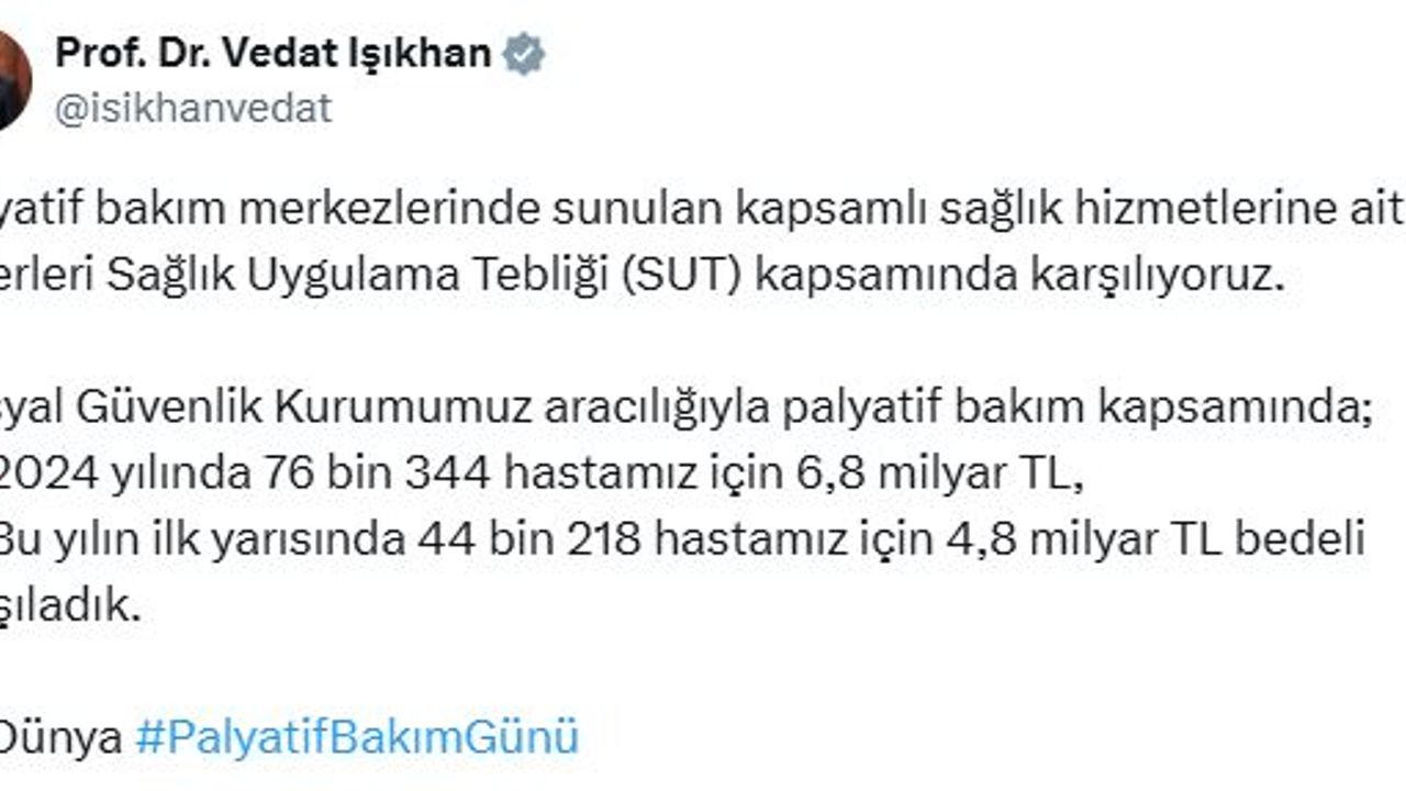 Nisa MİĞAL/ANKARA, (DHA)- ÇALIŞMA ve Sosyal Güvenlik Bakanı Vedat Işıkhan, palyatif bakım merkezlerinde sunulan sağlık hizmetlerine ait giderleri, Sağlık Uygulama Tebliği (SUT) kapsamında karşıladıklarını duyurdu.