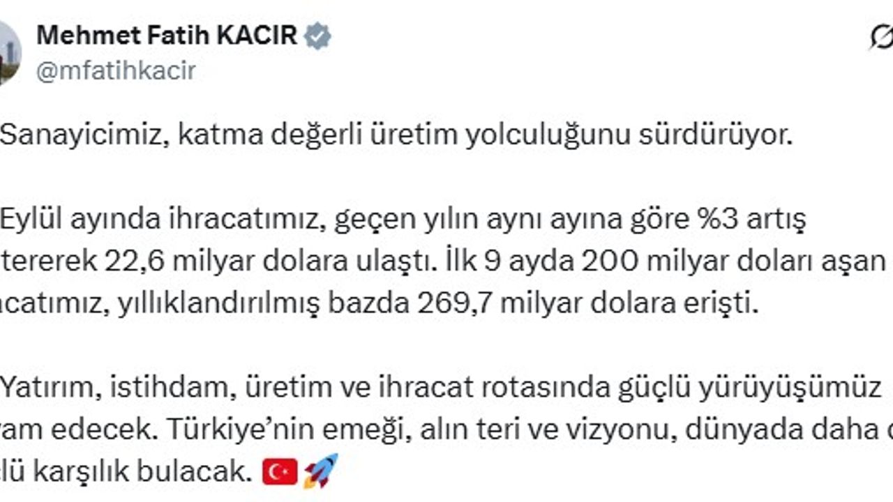 ANKARA, (DHA)- SANAYİ ve Teknoloji Bakanı Mehmet Fatih Kacır, "Sanayicimiz, katma değerli üretim yolculuğunu sürdürüyor. Eylül ayında ihracatımız, geçen yılın aynı ayına göre yüzde 3 artış göstererek 22,6 milyar dolara ulaştı" dedi.