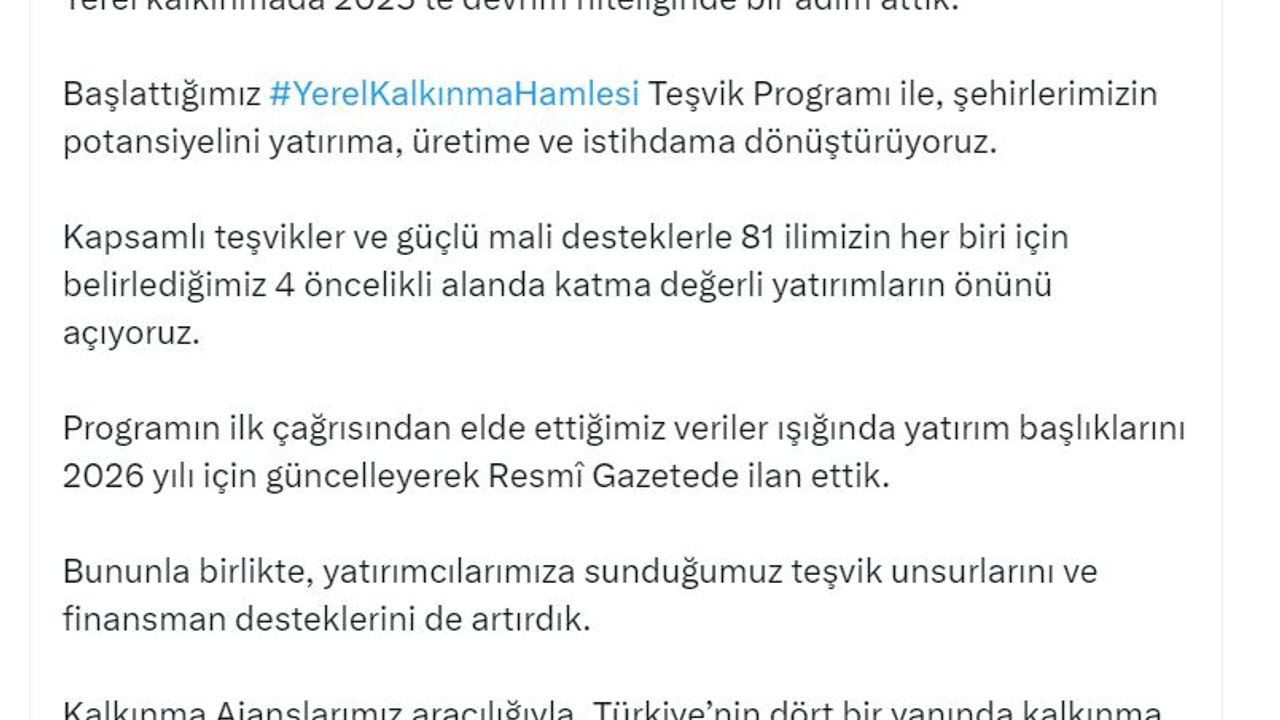 Bakan Mehmet Fatih Kacır, sanal medya hesabından yaptığı açıklamada, 'Yerel kalkınmada 2025'te devrim niteliğinde bir adım attık. Başlattığımız Yerel Kalkınma Hamlesi Teşvik Programı ile şehirlerimizin potansiyelini yatırıma, üretime ve istihdama dönüştürüyoruz. Kapsamlı teşvikler ve güçlü mali desteklerle 81 ilimizin her biri için belirlediğimiz 4 öncelikli alanda katma değerli yatırımların önünü açıyoruz. Programın ilk çağrısından elde ettiğimiz veriler ışığında yatırım başlıklarını 2026 yılı için güncelleyerek Resmi Gazete'de ilan ettik. Bununla birlikte, yatırımcılarımıza sunduğumuz teşvik unsurlarını ve finansman desteklerini de artırdık. Kalkınma Ajanslarımız aracılığıyla, Türkiye'nin dört bir yanında kalkınma hamlemizi büyütüyor, refahı yaygınlaştırıyoruz' ifadelerini kullandı. (DHA)